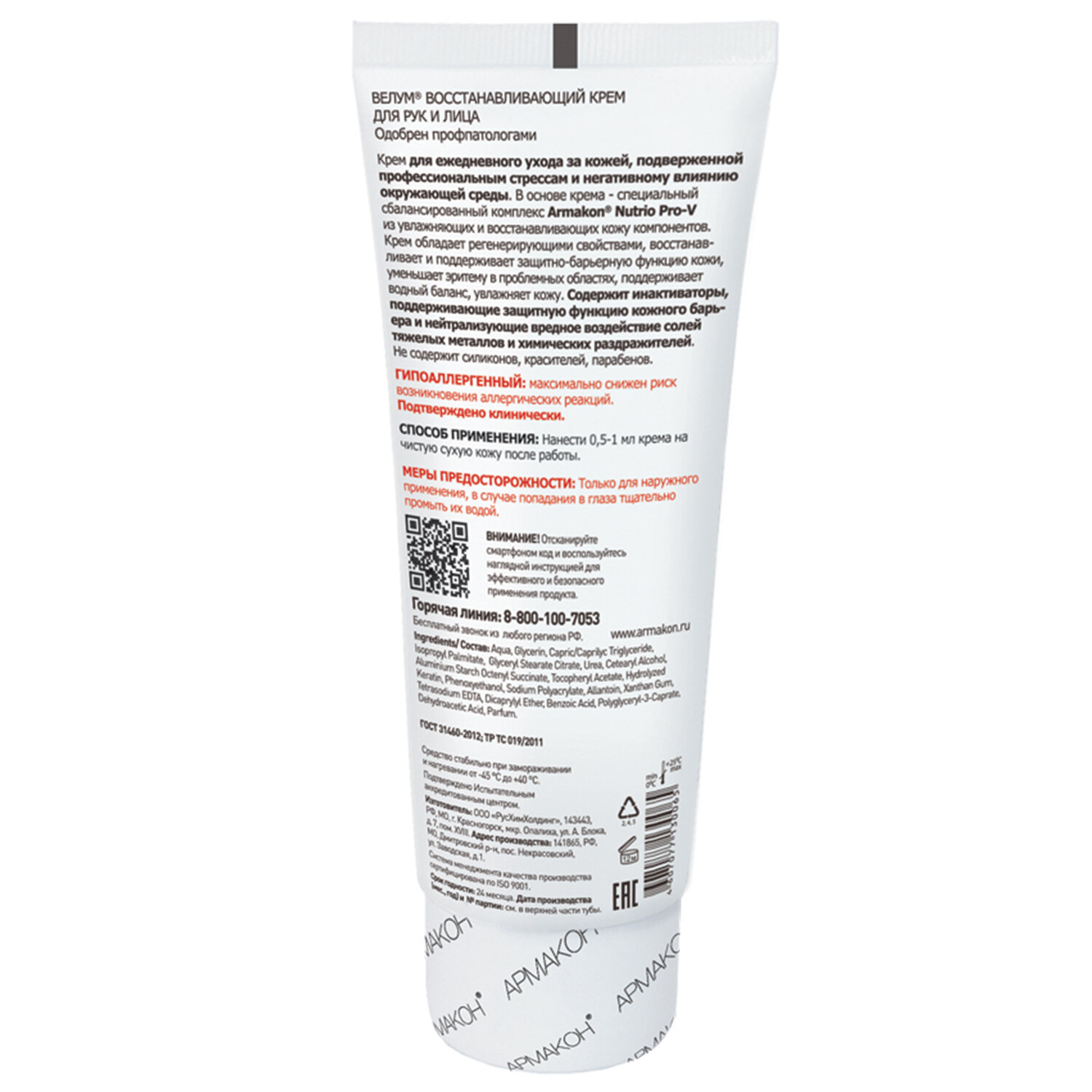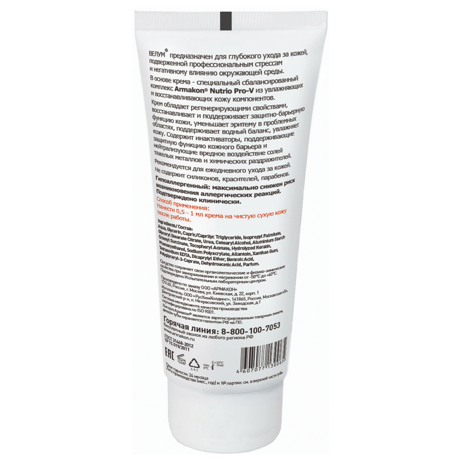 ВЕЛУМ® Крем для рук и лица восстанавливающий. • Предназначен для глубокого ухода за кожей, подверженной профессиональным стрессам (контакт с водорастворимыми, водонерастворимыми и комбинированными загрязнителями) и негативному влиянию окружающей среды (ветер, снег, низкие температуры и т.п.). • Обладает регенерирующими свойствами, восстанавливает и поддерживает защитно-барьерную функцию кожи, уменьшает эритему в проблемных областях, поддерживает водный баланс. • Специальный комплекс витаминов, увлажняющих и питательных компонентов Armakon® Nutrio Pro-V, успокаивает и смягчает кожу, помогает в полной мере восстановить целостность кожного покрова. • Содержит инактиваторы, поддерживающие защитную функцию кожного барьера и нейтрализующие вредное воздействие солей тяжелых металлов и химических раздражителей. • Рекомендуется для ежедневного ухода за кожей. • Не содержит силиконов, красителей, парабенов. • Гипоаллергенность и эффективность подтверждены клинически испытаниями в независимом испытательном центре. Одобрен профпатологами. • Соответствует ГОСТ 31460-2012, ТР ТС 019/2011. Способ применения: нанести 0,5 - 1 мл крема на чистую сухую кожу после работы.