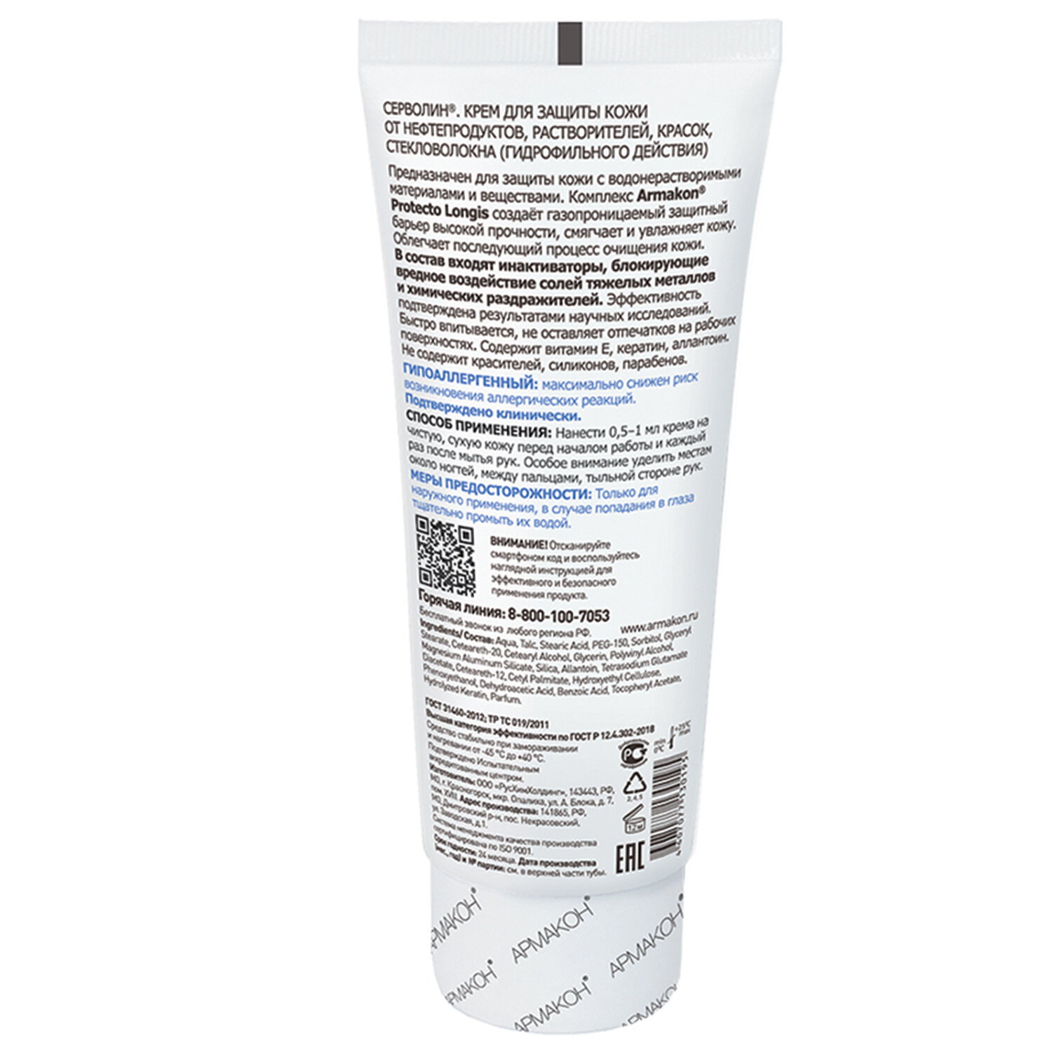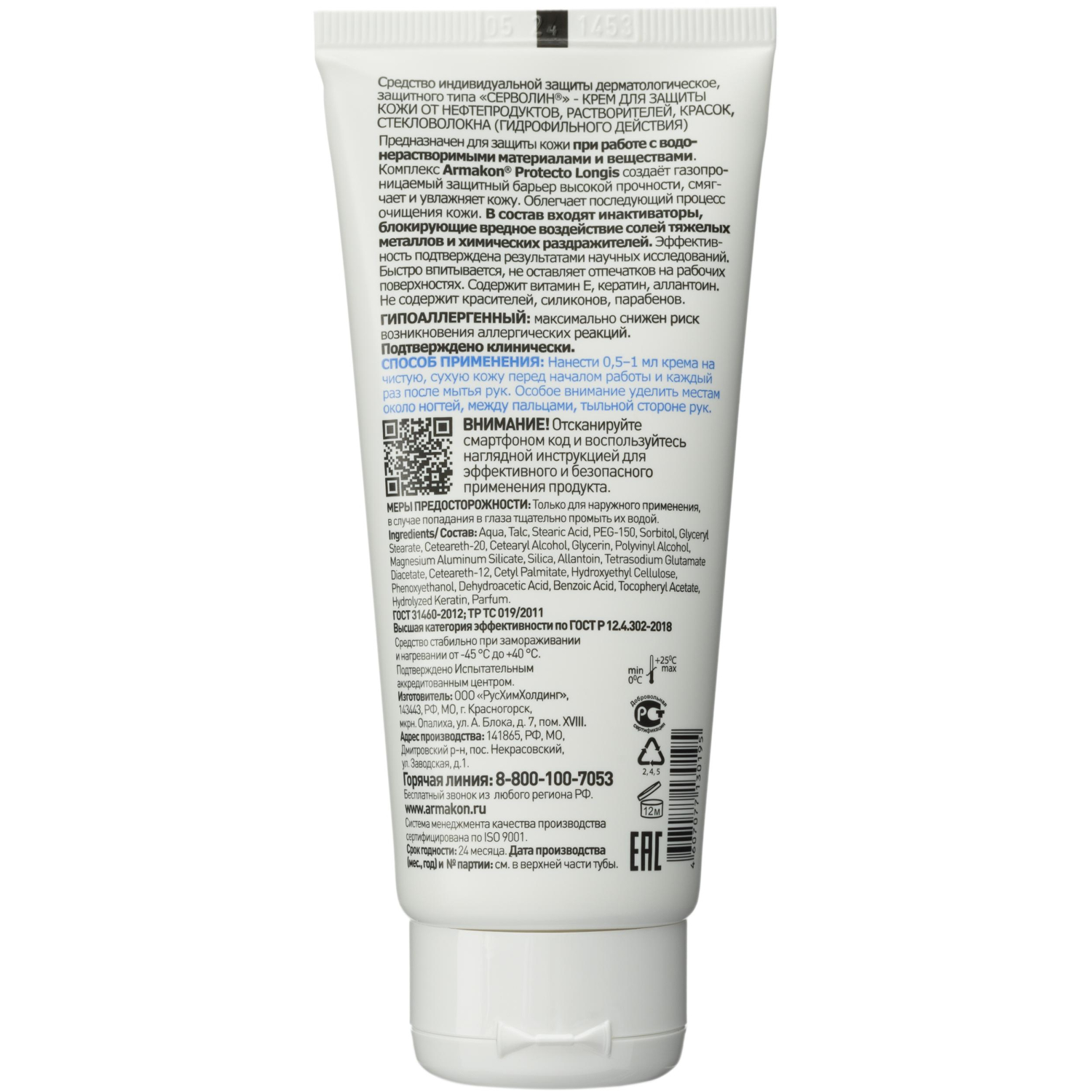 Защитный крем Армакон Серволин — крем для защиты кожи гидрофильного действия, направленный на предотвращение развития профессиональных дерматозов и снижение затрат на их лечение. Предназначен для защиты кожи при работе с нефтепродуктами, органическими растворителями, техническими маслами, смазками, сажей, лаками, красками, смолами, графитом, различными видами производственной пыли (угольной, металлической, стекольной), мазутом, стекловолокном и другими водонерастворимыми материалами и веществами. Комплекс Armakon Protecto Longis образует газопроницаемый защитный барьер высокой прочности, который препятствует проникновению водонерастворимых веществ к поверхности кожи и уменьшает адгезию загрязнителей с кожей. Содержит инактиваторы, блокирующие вредное воздействие химических раздражителей. Защитная способность подтверждена результатами научных исследований. В состав входят компоненты, ухаживающие за кожей (витамин Е, кератин, аллантоин). Витамин Е -антиоксидант, увлажняет кожу, стимулирует процесс регенерации тканей, активизирует тканевое дыхание, замедляет процесс формирования свободных радикалов и окисления липидов; кератин способствует восстановлению поврежденного защитного слоя кожи, смягчает. Гипоаллергенность подтверждена сертификационным центром Service Allergy Swiss (SAS, Швейцария). Крем быстро впитывается, не оставляет отпечатков на рабочих поверхностях. Не содержит красителей, силиконов, парабенов, формальдегид-производных. Соответствует стандартам ТР ТС 019/2011, ГОСТ 31460-2012. Объем тубы — 100 мл. Условия хранения: избегать попадания прямых солнечных лучей. Срок годности от даты изготовления 24 месяца.