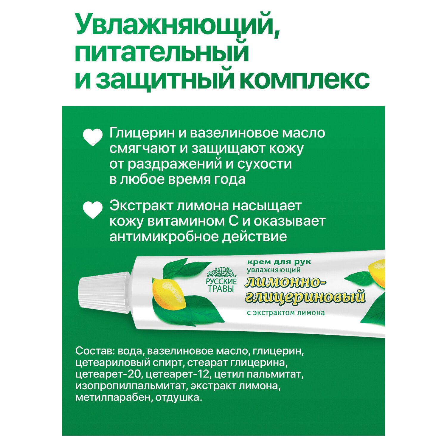 Крем для рук с глицерином и экстрактом лимона от бренда РУССКИЕ ТРАВЫ – это глубокое увлажнение и нежная забота о вашей коже Имеет формулу с увлажняющими, смягчающими и питающими компонентами.
