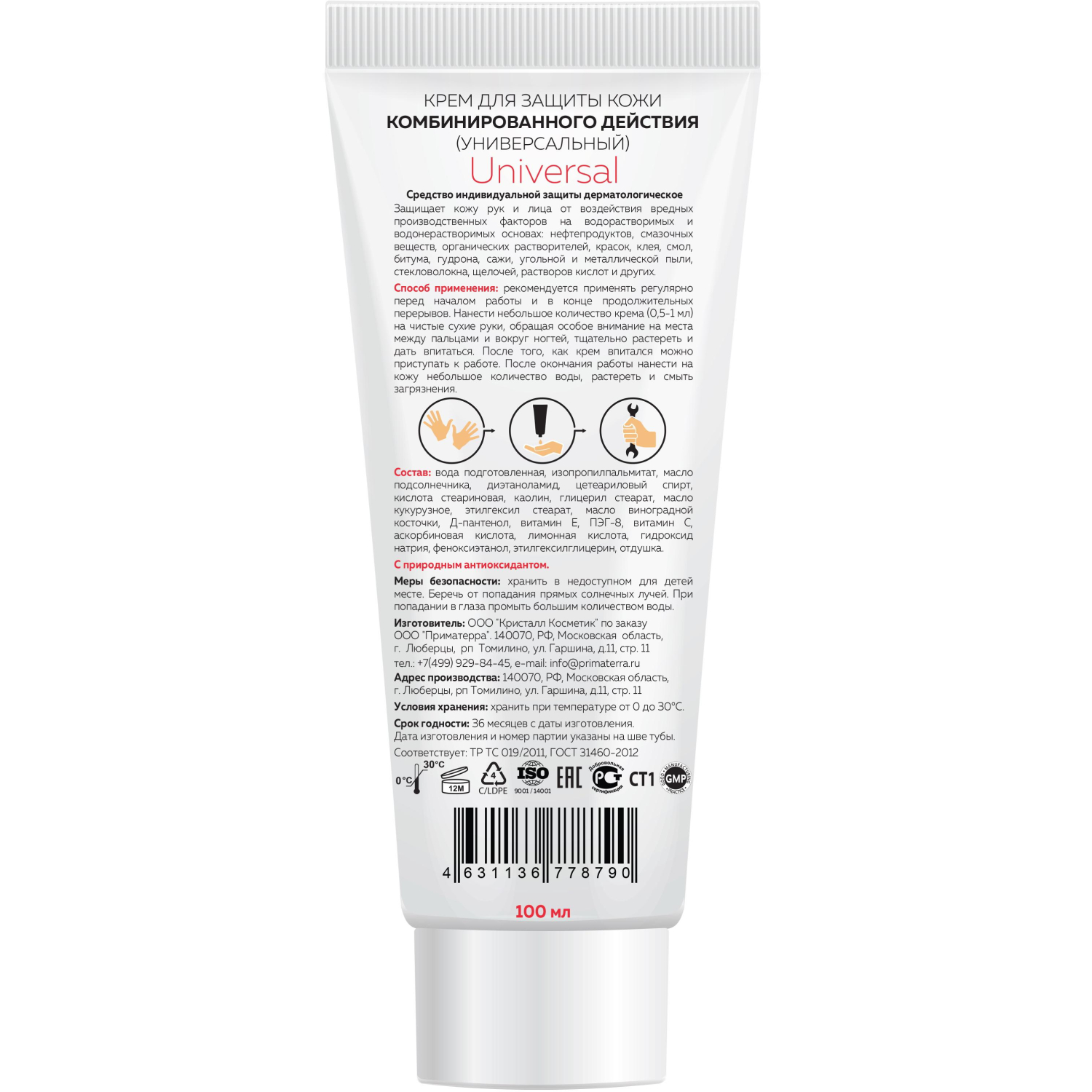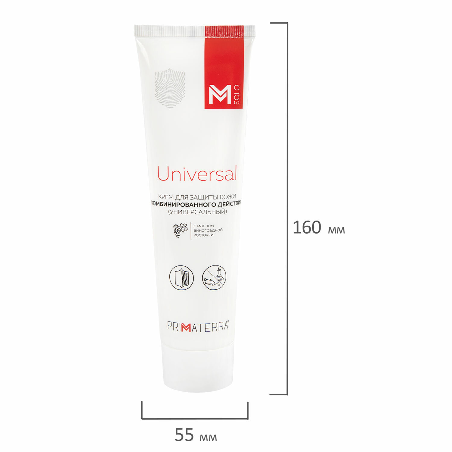 Крем защитный М Solo Universal для рук защищает во время работ при переменном воздействии водорастворимых (различные водные растворы кислот, щелочей, солей, синтетических моющих и дезинфицирующих средств, органических спиртов, смазочно-охлаждающих и тормозных жидкостей, цемента, бетона, глины, извести, тосола, фенола, щелочно-масляных эмульсий) и водонерастворимых веществ (нефть, керосин, бензин, дизельное топливо, мазут, битум, жир, графит, металлическая пыль, органические растворители, СОЖ, масла минеральные нефтяные, лаки, краски, клеи, смолы, зола, сажа и другое). Содержит компоненты (масло виноградной косточки, D-пантенол и витамин E), которые защищают, смягчают и увлажняют кожу рук не нарушая ее физиологических функций. Легко наносится на кожу, не создает неудобства при работе, после работы легко смывается. Не вызывает коррозии на металлических деталях, не портит обрабатываемые изделия и материалы.