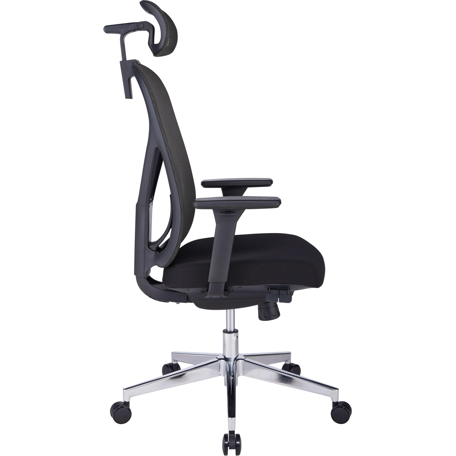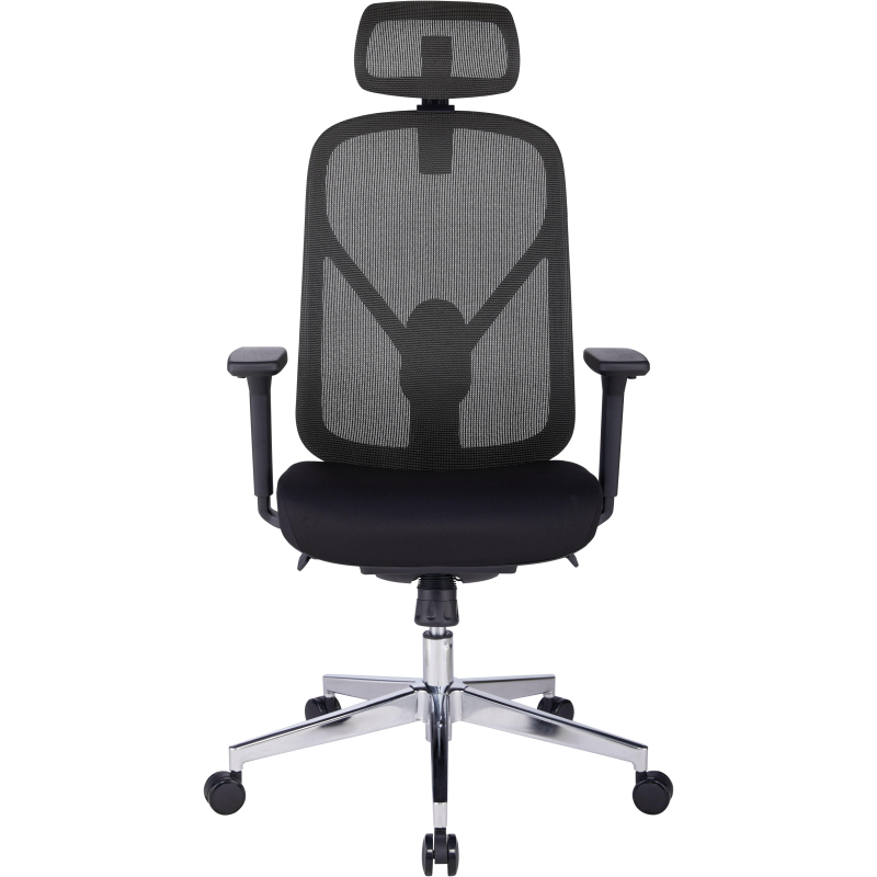 Кресло для руководителя. Спинка кресла изготовлена из сетки, свободно пропускающей воздух. Подголовник каркасный состоит из сетки, фиксируется по высоте и углу наклона. Сиденье тканевое, износостойкое. Подлокотники изготовлены из пластика и зафиксированы. Крестовина изготовлена из хромированного металла. Кресло имеет регулировку по высоте (газлифт). Максимальная статическая нагрузка на кресло — 120 кг.