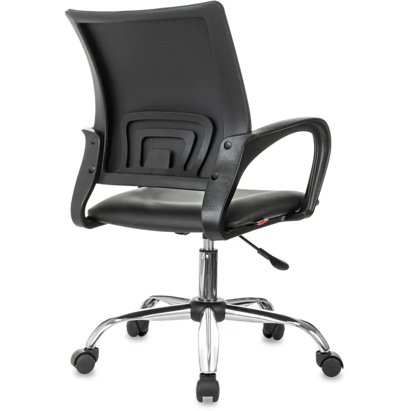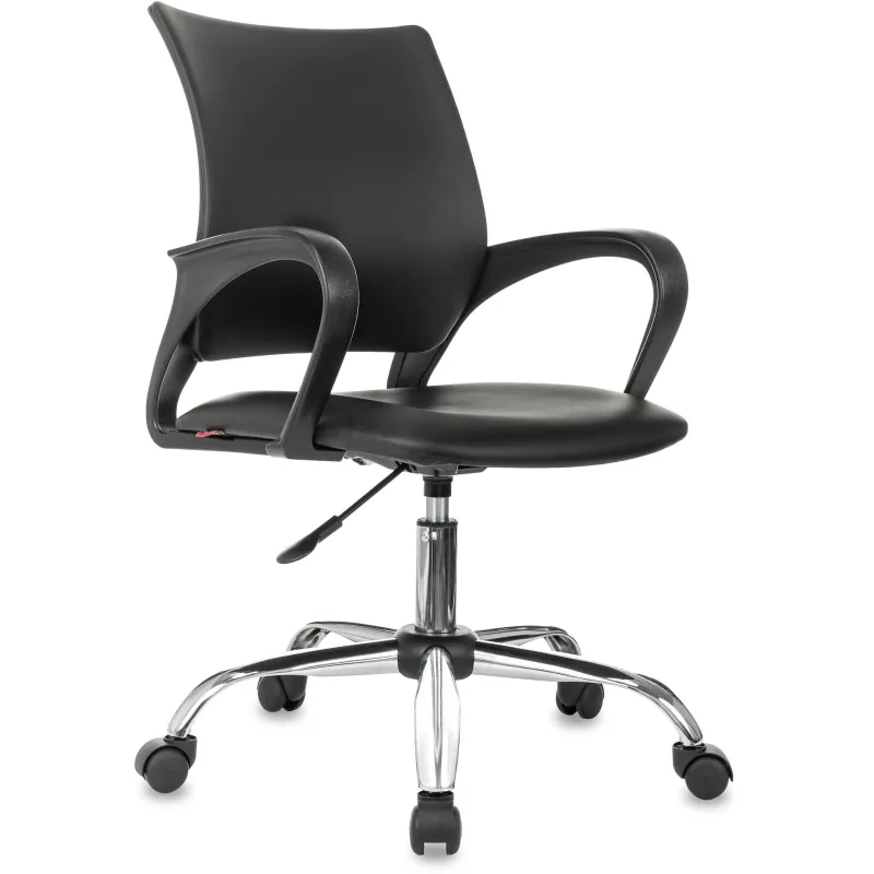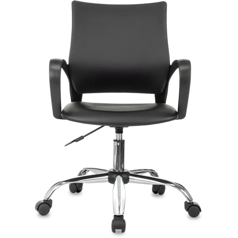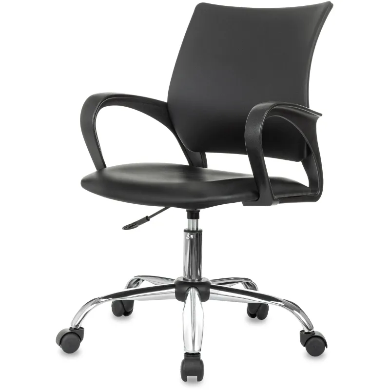 Кресло офисное Комус Мебель с обивкой из экокожи, с подлокотниками, без механизма качания. Современное компактное и функциональное кресло позволяет с комфортом проводить время в офисе, дома, кабинете. Сиденье обито износостойкой экокожей. За счёт современного стиля идеально впишется в любой интерьер. Кресло имеет регулировку высоты с помощью газлифта. Кресло установлено на прочную металлическую крестовину, в которую надёжно закреплены колёсики. Максимальная нагрузка составляет до 150 кг. Эргономичная спинка с поясничным упором, который поддерживает спину и не позволяет ей затекать. В кресле имеются широкие пластиковые подлокотники. Соответствует стандарту BIFMA.