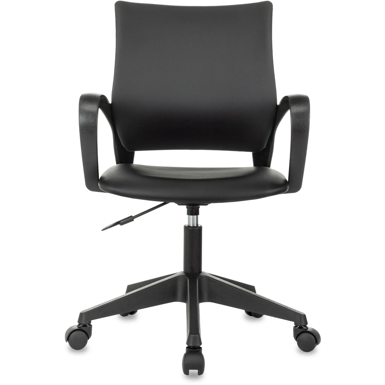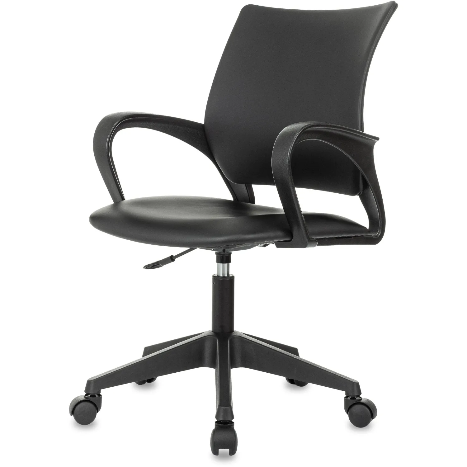Кресло офисное с обивкой из экокожи, с подлокотниками, без механизма качания. Современное компактное и функциональное кресло позволяет с комфортом проводить время в офисе, дома, кабинете. Сиденье обито износостойкой экокожей. За счет современного стиля идеально впишется в любой интерьер. Кресло имеет регулировку высоты с помощью газлифта. Кресло установлено на прочную пластиковую крестовину, в которую надёжно закреплены колёсики. Максимальная нагрузка составляет до 150 кг. Эргономичная спинка с поясничным упором, который поддерживает спину и не позволяет ей затекать. В кресле имеются широкие пластиковые подлокотники. Соответствует стандарту BIFMA.