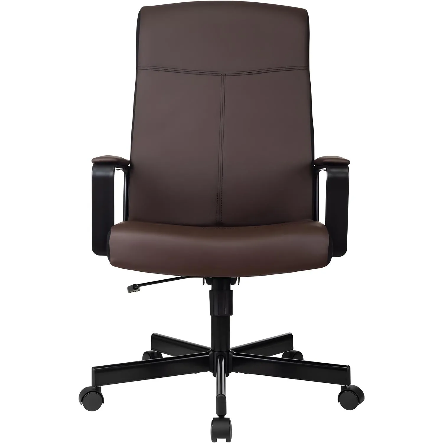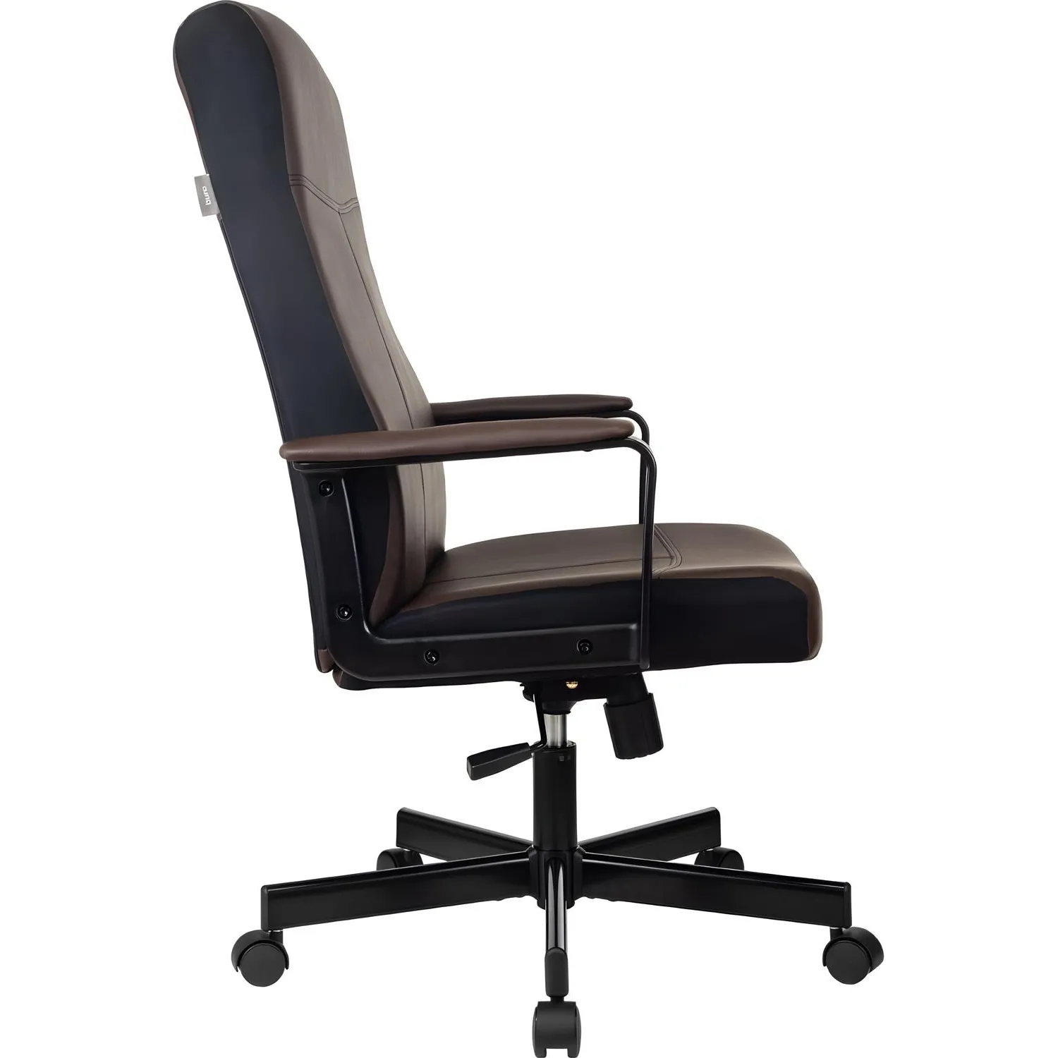 Кресло для руководителя Бюрократ Dominus. Обивка кресла выполнена из экокожи коричневого цвета. Боковины, задняя часть сиденья и спинки выполнены из полиэстера черного цвета. Крестовина металлическая, окрашенная в черный цвет. Механизм Top Gun — свободное качание с фиксацией в вертикальном положении. Угол между спинкой и сиденьем не меняется. Кресло имеет регулировку по высоте (газлифт). Максимальная статическая нагрузка на кресло — 120 кг.
