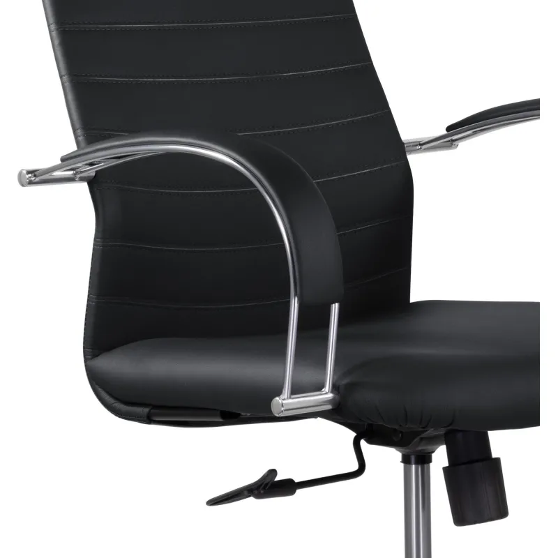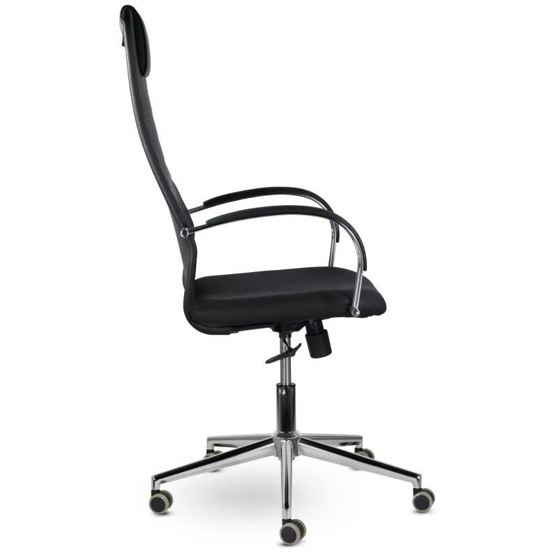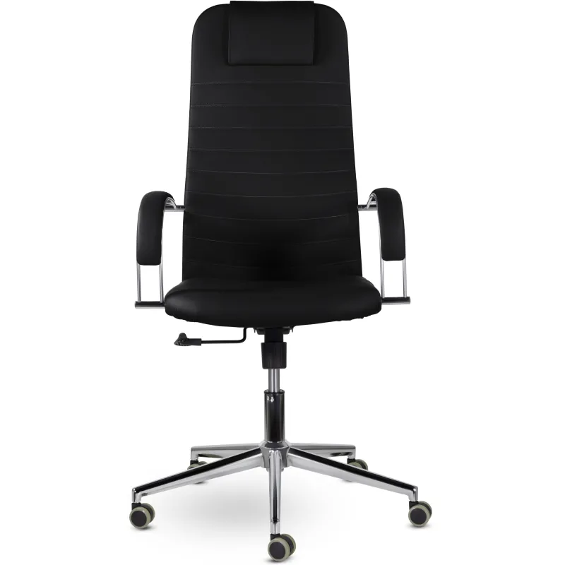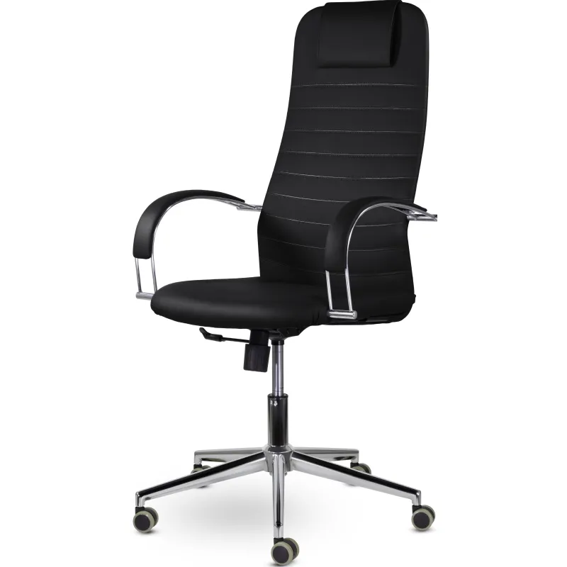 Кресло руководителя. Стильное кресло повышенного комфорта с высокой эргономичной спинкой и мягким подголовником подходит как сотрудникам, так и руководителям. Оно оснащено широкими двусторонними подлокотниками и механизмом качания Топ-Ган. Эта модель прекрасно дополнит интерьер открытого офиса или домашнего кабинета.
