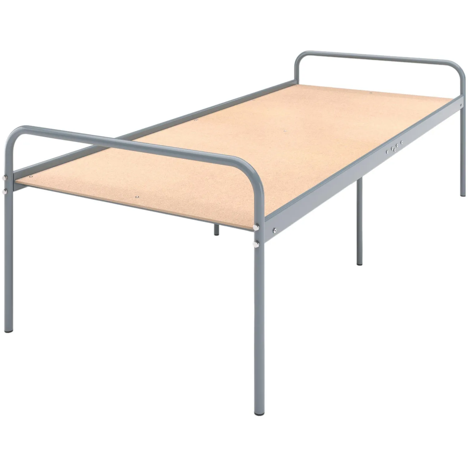 Кровать одноярусная Комус Мебель металлическая для взрослых, для работников на стройках, для общежитий. Нагрузка на кровать составляет 150 кг. Кровать односпальная. Изготавливается из металлической профильной трубы: спинка — из круглой металлической профильной трубы диаметром 25 мм с толщиной стенок не менее 1,5 мм; боковины — из плоскоовальной металлической профильной трубы 60×15 мм с толщиной стенок не менее 1 мм; основание — из квадратной металлической профильной трубы 20×20 мм с толщиной стенок не менее 1,5 мм; средние ножки — из круглой металлической профильной трубы 20 мм с толщиной стенок не менее 1,5 мм. Металлическая труба покрыта порошковой краской, стойкой к химическим и механическим воздействиям. На свободных концах труб установлены заглушки из ударопрочных полимеров, предотвращающие повреждение напольного покрытия. Размер спального места — 800×1900 мм. Настил кровати выполнен из МДФ толщиной 6 мм. Кровать разборная. Для сборки используются DIN болт, гайка М6, болт М8, саморезы с пресс шайбой.