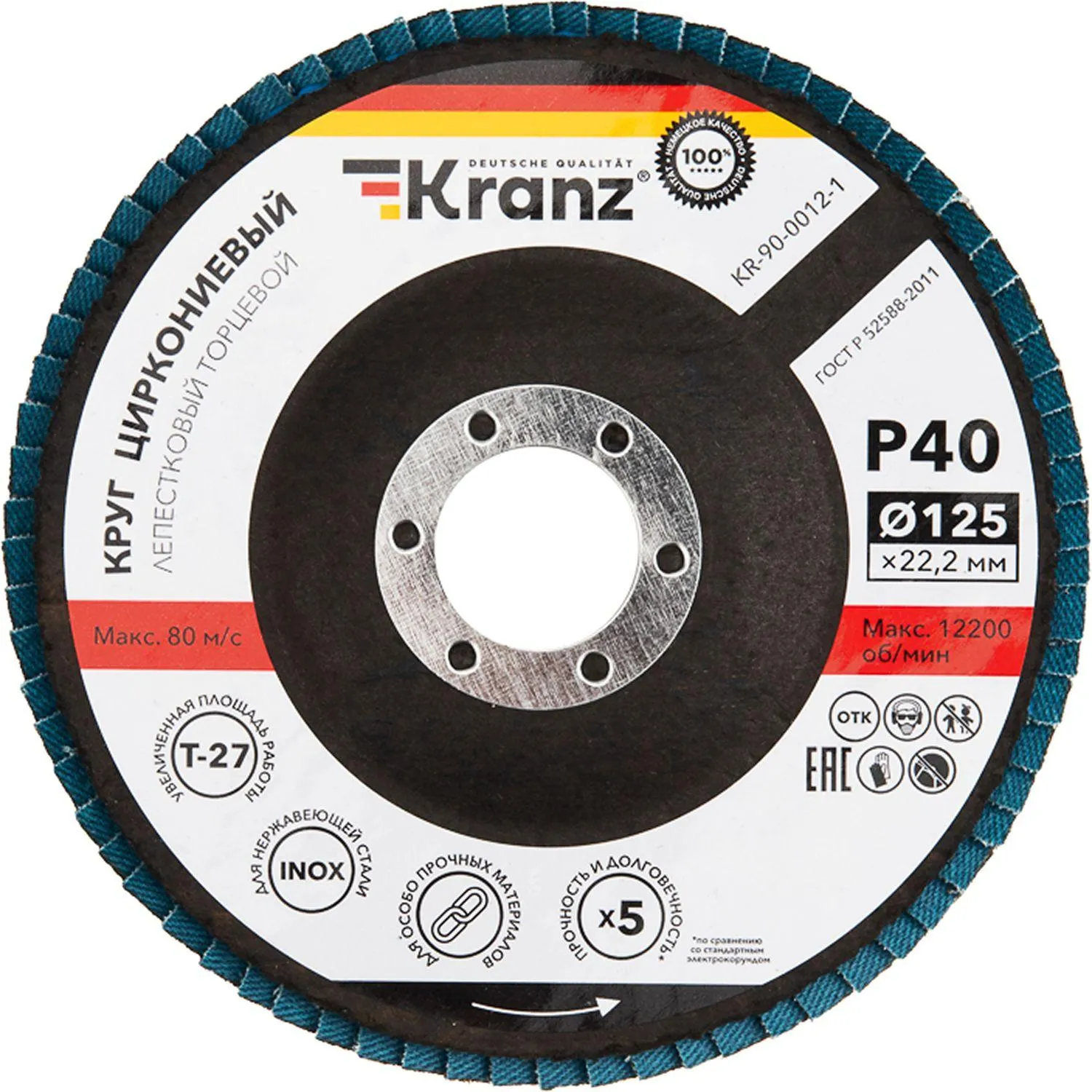 О товаре «Круг лепестковый торцевой, циркониевый, P40, 125х22,2мм INOX KRANZ»