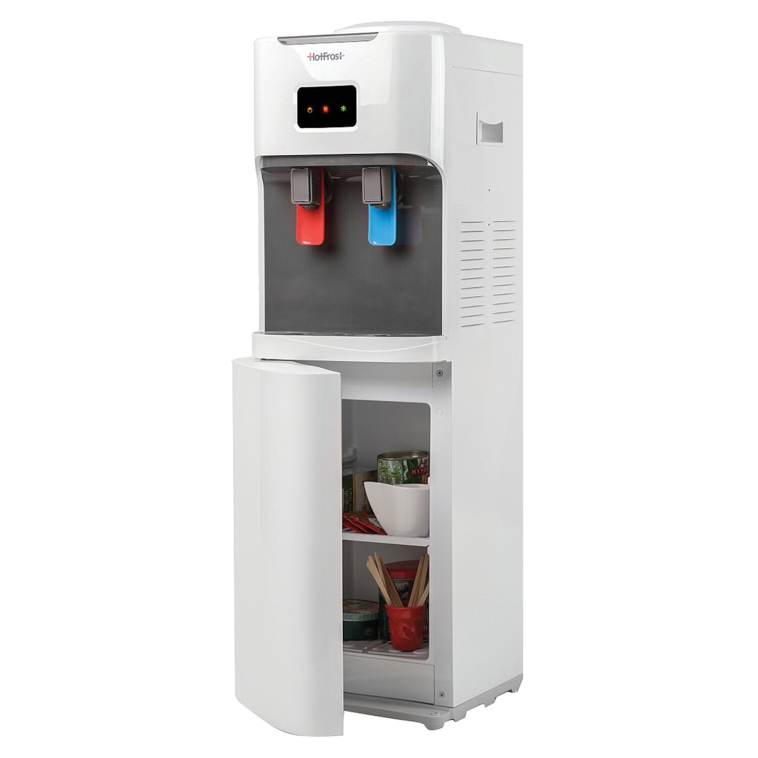 В кулере используется электронный тип охлаждения, поэтому Вы всегда сможете утолить жажду стаканом прохладной воды. Увеличенная мощность нагрева делает этот аппарат гораздо производительнее: он способен нагревать до 6 литров воды в час. Это прекрасный выбор для тех, кто любит побаловать себя горячим чаем и кофе. Приятным бонусом станет размещенный в нижней части шкафчик, в котором можно хранить чай, кофе, сахар или одноразовые стаканчики.