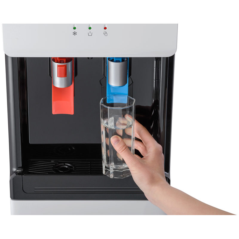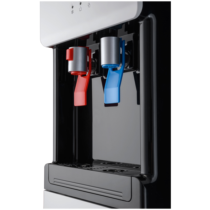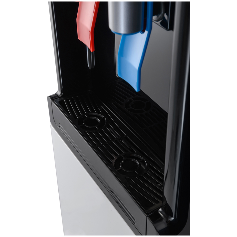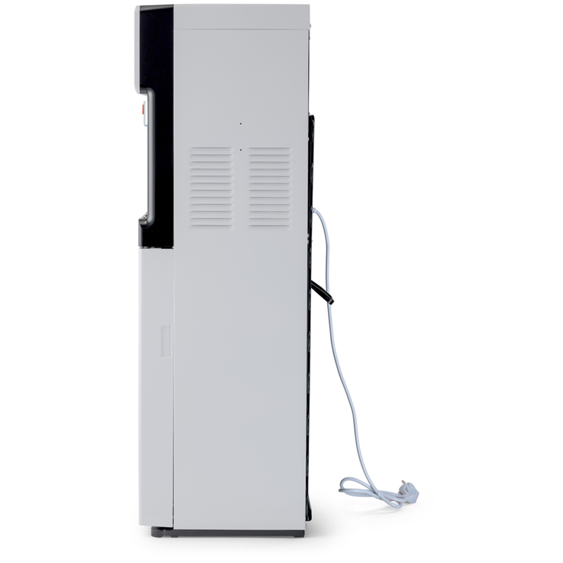Компрессорный кулер с удобной нижней загрузкой бутыли. Основные части кулера выполнены из пластика, а боковые стенки из металла, что позволяет прикрепить держатель для стаканов на магните. На боковых стенках имеются технические отверстия и для крепления держателей на шурупах. Длинные удобные PUSH-краны с защитой от случайного нажатия на горячем кране. Широкий лоток для сбора капель.