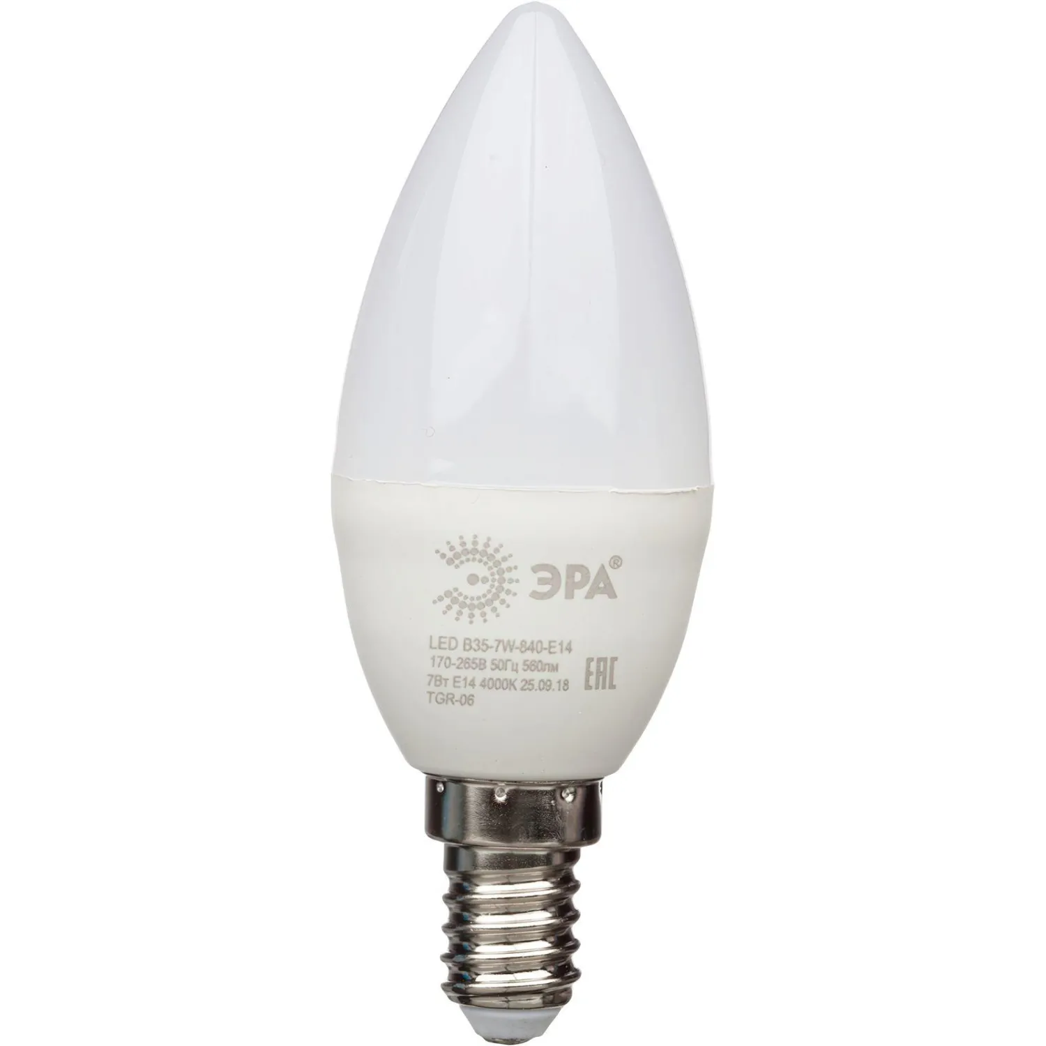 Светодиодная лампа классической формы свечи ЭРА (матовая), излучает естественный белый свет, с цоколем E14, мощность 7 Вт. Современный, качественный и доступный источник света. Создает яркое ровное освещение и экономит до 90% электроэнергии по сравнению с лампой накаливания с аналогичным световым потоком. Модель LED B35-