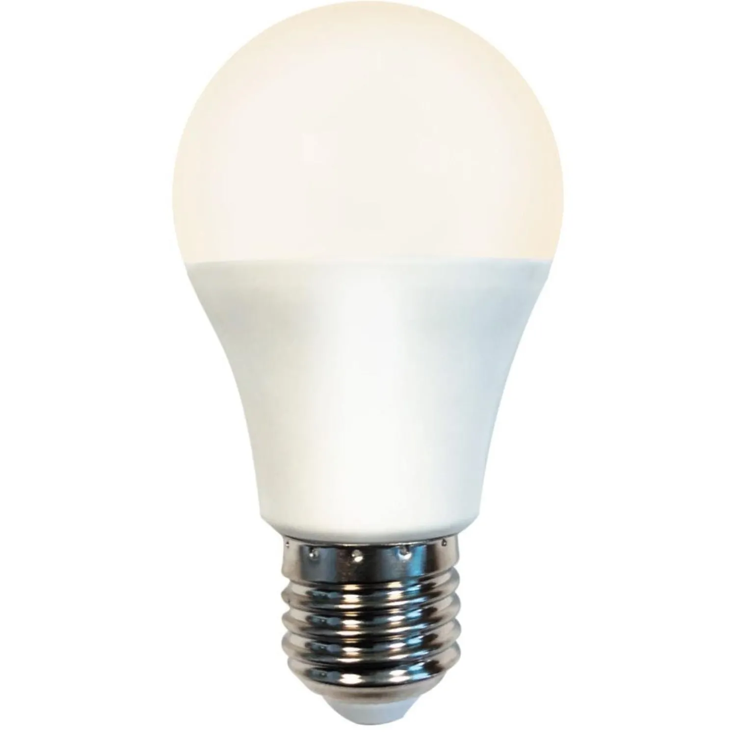 Светодиодная лампа мощностью 15 Вт с цоколем E27 излучает тёплый белый свет (3000 К). Лампа имеет колбу типа A и световой поток 1200 Лм, что соответствует яркости 100 Вт лампы накаливания.
