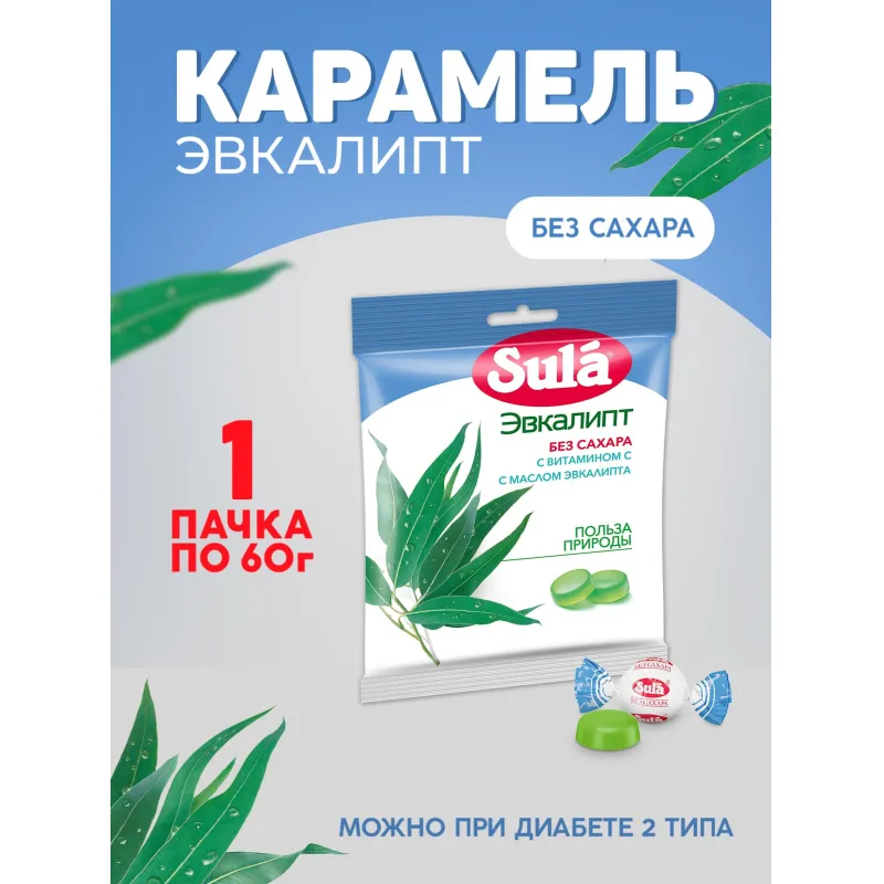 Леденцы Sula Эвкалипт, без сахара, с витамином С, с маслом эвкалипта, 60 г — это леденцы без сахара со вкусом эвкалипта и эфирным маслом эвкалипта в составе.