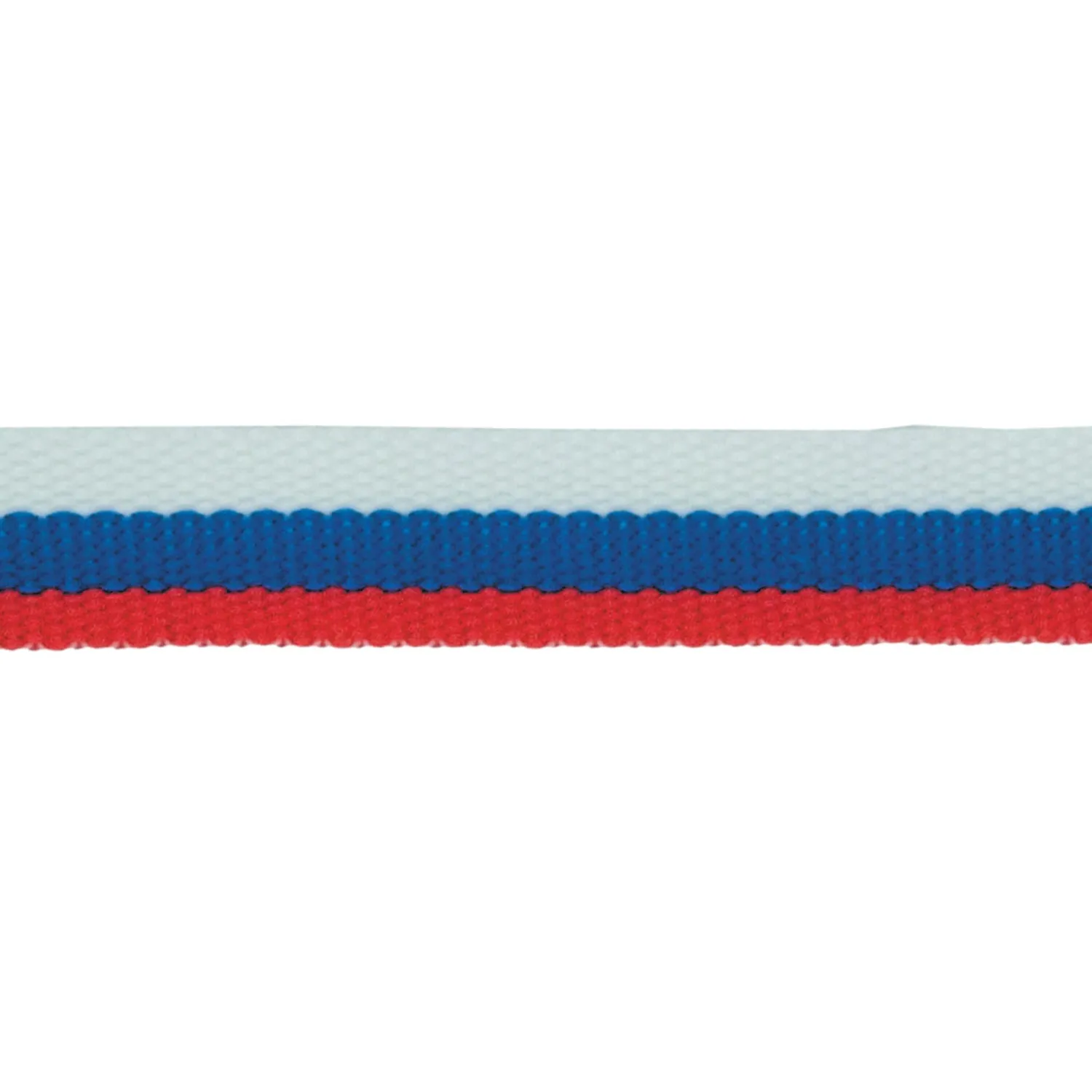 Лента предназначена для крепления медалей и используется в наградной атрибутике на спортивных и торжественных мероприятиях. Изготовлена из полиэстера и оформлена в цветах триколора: белый, синий, красный. Металлический карабин золотистого цвета надёжно фиксирует медаль.