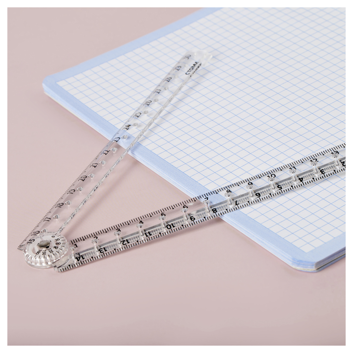 Линейка раскладная «СТАММ» предназначена для чертежно-измерительных работ. Длина шкалы варьируется от 15 см до 30 см, ширина линейки – от 1,5 см до 3 см. У изделия четкая контрастная миллиметровая шкала. Представлено со встроенным транспортиром. Линейка изготовлена из качественного полистирола и имеет гладкую глянцевую поверхность. Упакована в пакет с европодвесом. Цвет изделия – прозрачный.