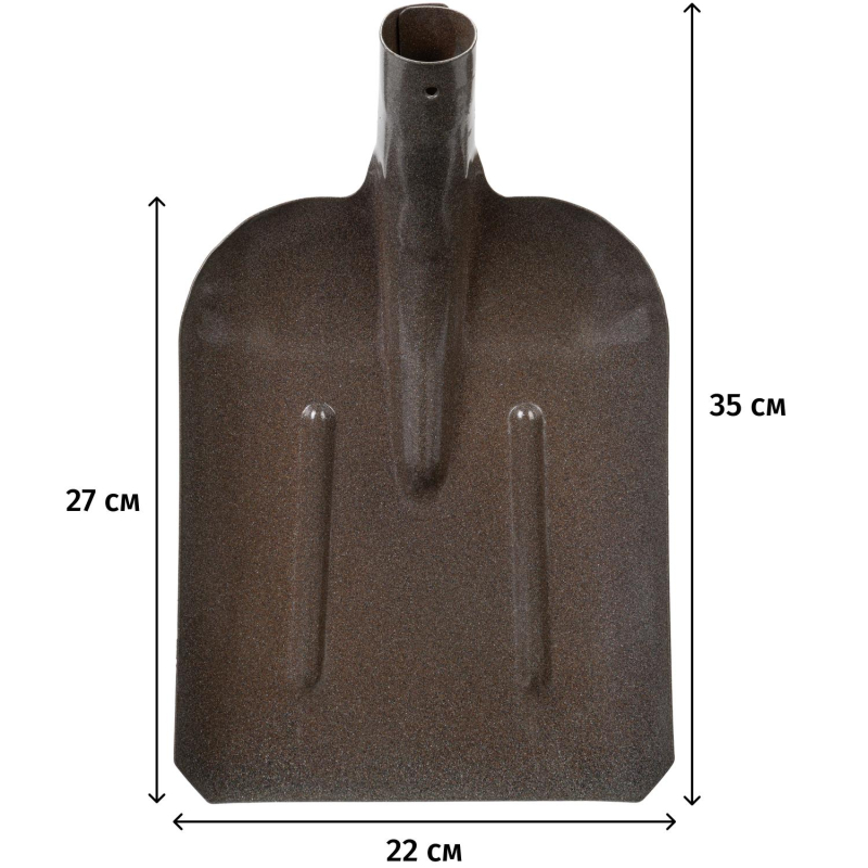 Подходит для уборки мусора, снега или сыпучих материалов. Совковая форма и увеличенная ширина рабочей части делают её удобной для перемещения большого объёма материала. Изделие выполнено из стали и дополнено рёбрами жёсткости, которые повышают прочность и устойчивость к деформации. Лопата имеет классическую форму, её общая длина составляет 35 см. Длина рабочей части — 27 см, ширина — 22 см. Диаметр тулейки — 40 мм. Вес изделия — 0.8 кг.