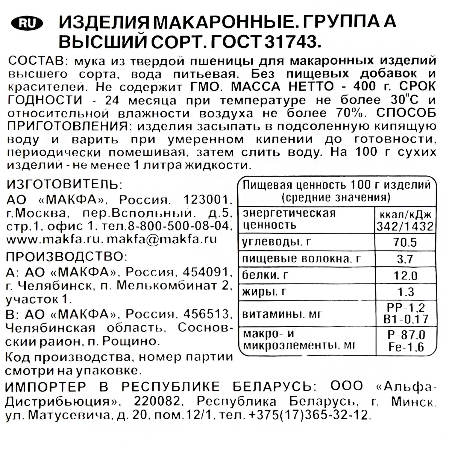 Состав: мука из твердой пшеницы для макаронных изделий высшего сорта, вода питьевая.