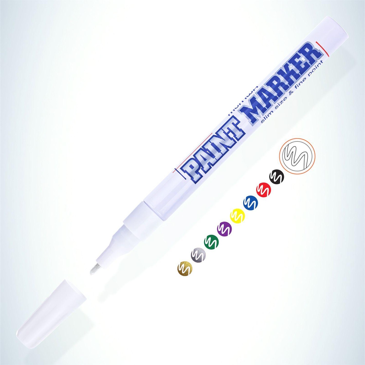Маркер оснащён круглым наконечником, обеспечивающим толщину линии от 1 до 2 мм, что позволяет наносить как тонкие, так и более заметные линии. Благодаря клапанному механизму пишущего узла, маркер исключает растекание краски, предотвращает её преждевременное пересыхание и гарантирует равномерное нанесение на поверхность.