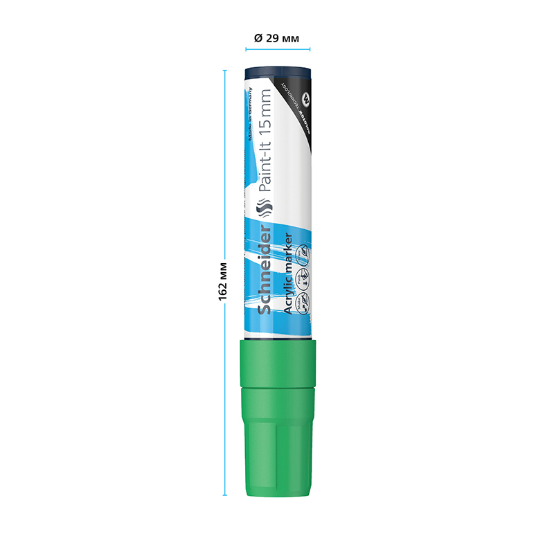 Schneider Paint-It 330 - акриловый маркер для творчества и хобби. Толщина линии – 15 мм, форма наконечника – прямоугольная, цвет чернил - зеленый. Акриловые чернила на водной основе быстро сохнут, обеспечивают интенсивность цвета, высокие укрывные свойства и стойкость после высыхания. Не содержат ксилол и толуол. Подходит для работ на различных поверхностях: бумага, дерево, камень, гипс и т.д. Перед использованием маркер необходимо встряхнуть для смешивания и равномерной подачи чернил.