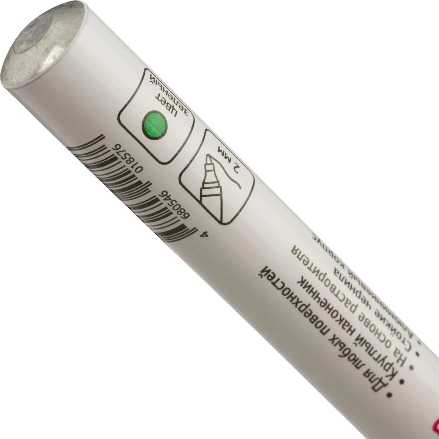 Инструкция по применению: перед использованием необходимо встряхнуть маркер с закрытым колпачком, затем надавить на наконечник, чтобы краска начала поступать, и нанести её на поверхность. После использования маркер следует плотно закрыть.