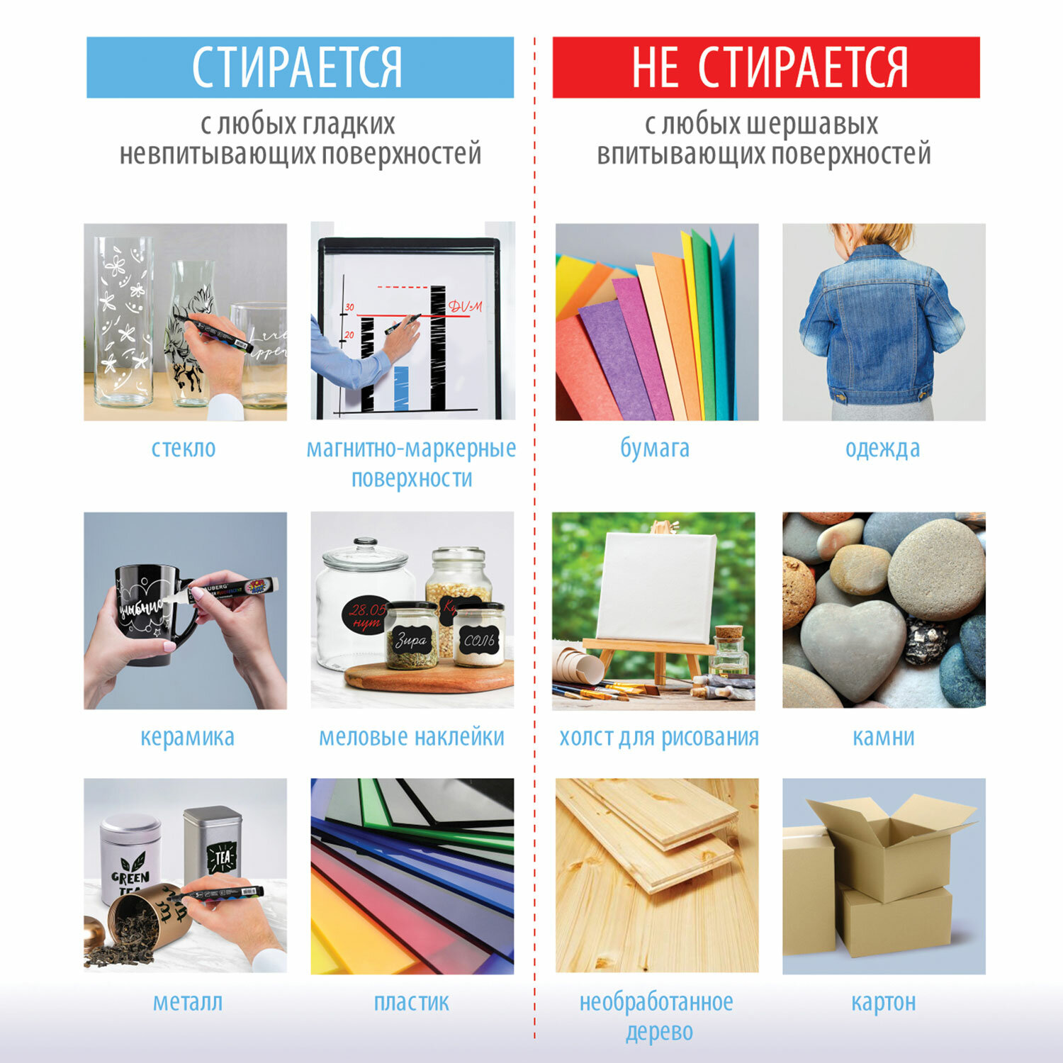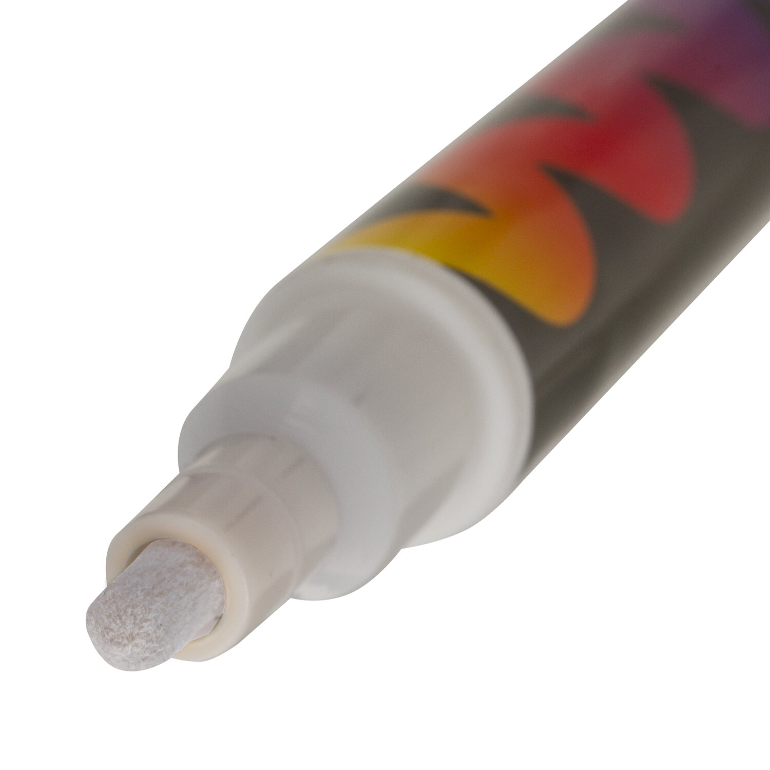 Предназначен для росписи, создания рисунков и надписей на зеркалах, стекле, меловой пленке и прочих гладких и прозрачных невпитывающих поверхностях. Рисунок получается плотный и яркий. Чернила на водно-меловой основе белого цвета без резкого запаха. Толщина линии письма - от 1 мм до 3,5 мм, зависит от угла наклона мелового маркера. Круглый корпус выполнен из пластика.