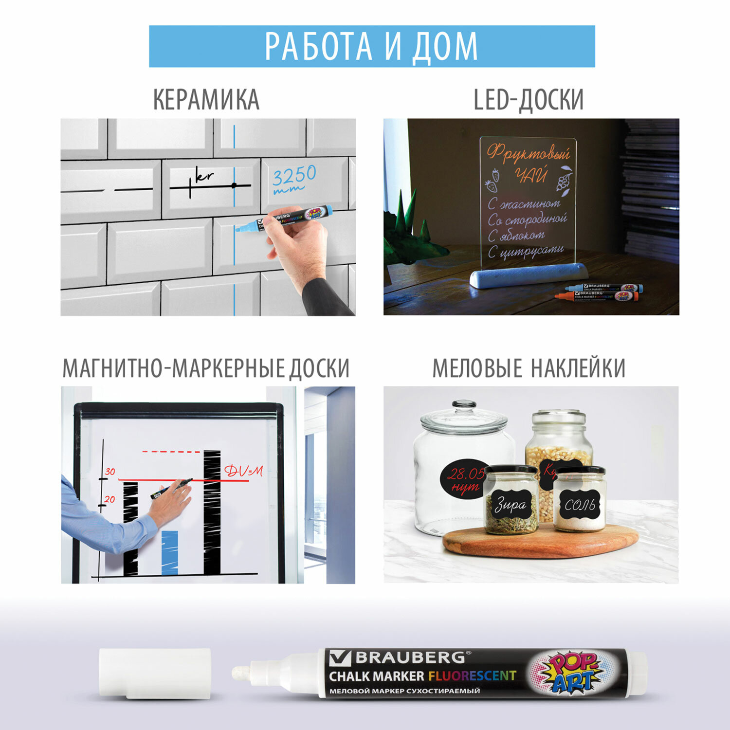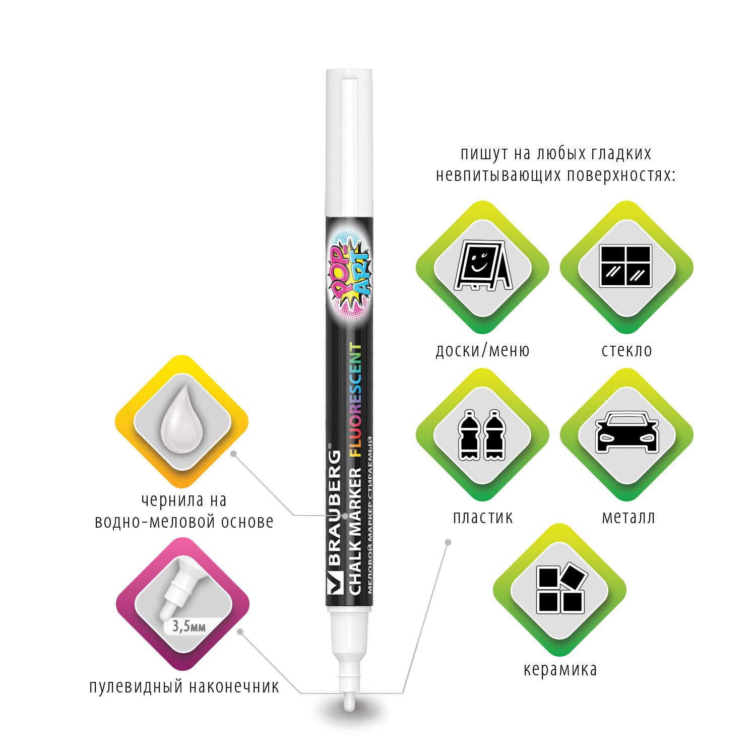 О товаре «Маркер меловой "POP-ART" БЕЛЫЙ, 3,5 мм, стираемый, для гладких поверхностей, BRAUBERG, 151519»