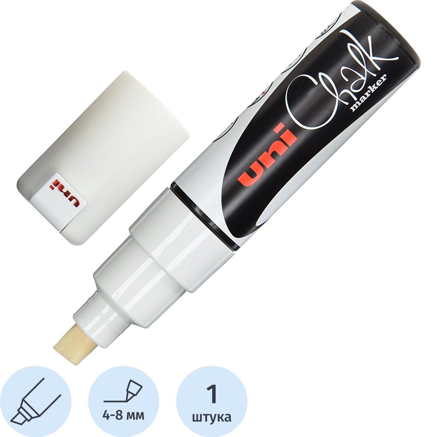 О товаре «Маркер меловой Uni Chalk PWE-8K белый скошенный наконечник (толщина линии 4-8 мм)»