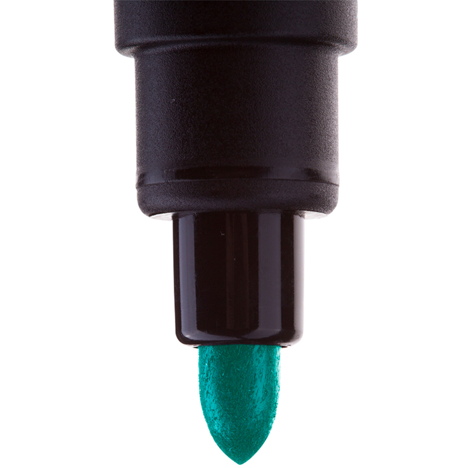 Перманентный маркер, зеленый. Предназначен для письма на большинстве поверхностей. Чернила на спиртовой основе, термостойкие (до 100°C). Устойчивый к воде, стиранию, атмосферным воздействиям. Пулевидный наконечник, толщина линии 2,5 мм.