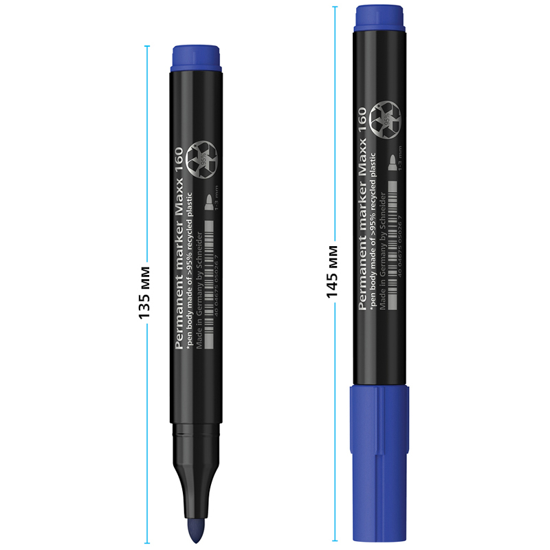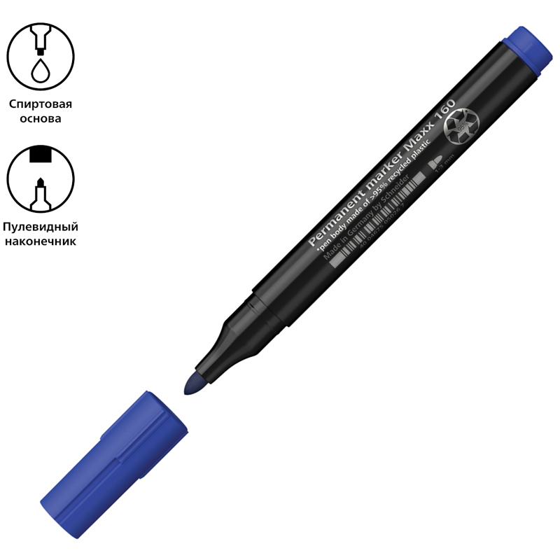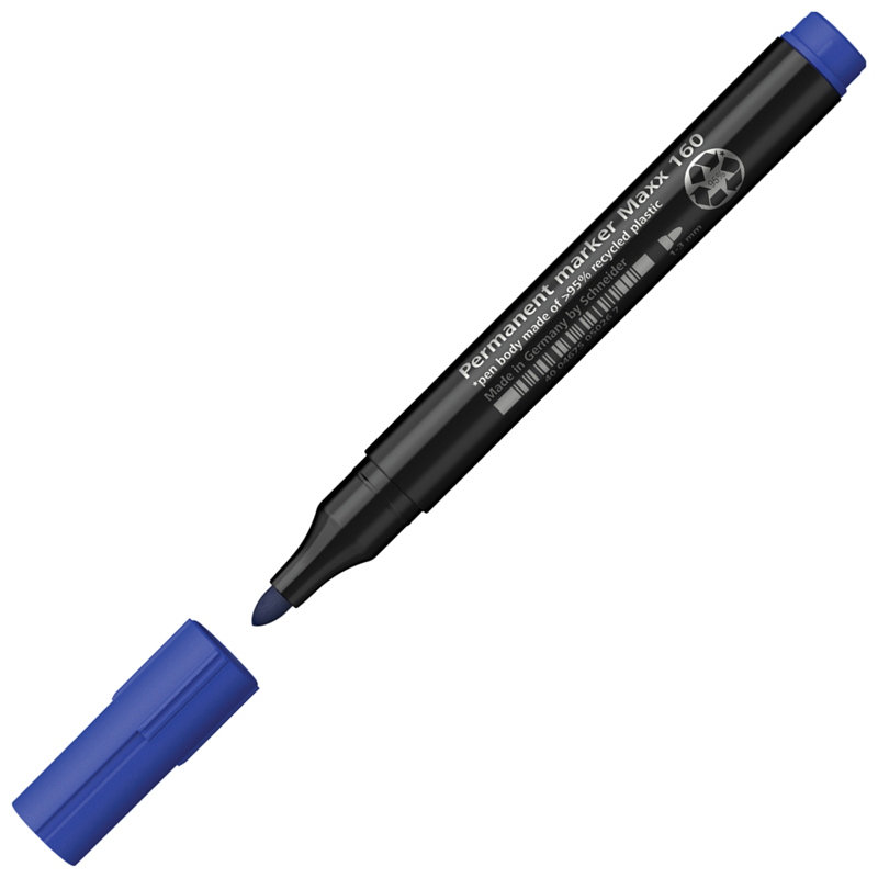 Перманентный маркер Schneider Maxx 160 с чернилами на спиртовой основе подходит для большинства твёрдых поверхностей. Маркер представлен с пулевидным пишущем узлом. Цвет чернил - синий, толщина линии варьируется от 1 до 3 мм. Изделие может находиться без колпачка до 3 дней и не высыхать. Надписи не выцветают и не размазываются. Безопасен для использования и не содержит ксилол и толуол.