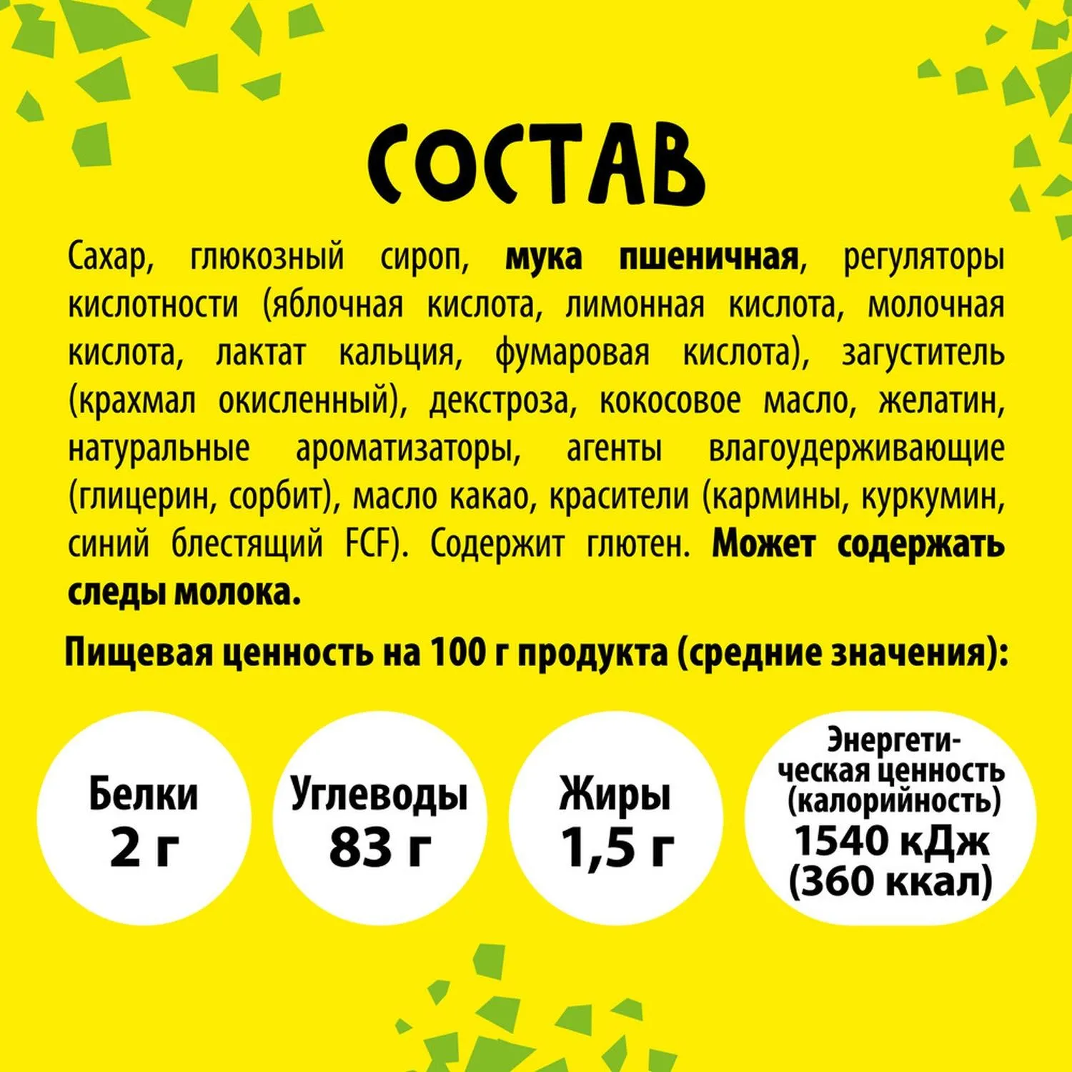 Состав: сахар, глюкозный сироп, мука пшеничная, рeгyлятoры кислoтноcти (яблочная кислота, лимоннaя кислота, молочная кислота, лактат кальция, фумаровая кислота), мальтодекстрин, гидрогенизированное кокосовое масло, агент влагоудерживающий (глицepин), загуститель (ксантановая камедь), aроматизaтopы, красители (кармины, куркумин, синий блecтящий FCF), экстракт сладкого картофеля, концентрированный сок чёрной моркови. Содержит глютен. Может содержать следы молока.