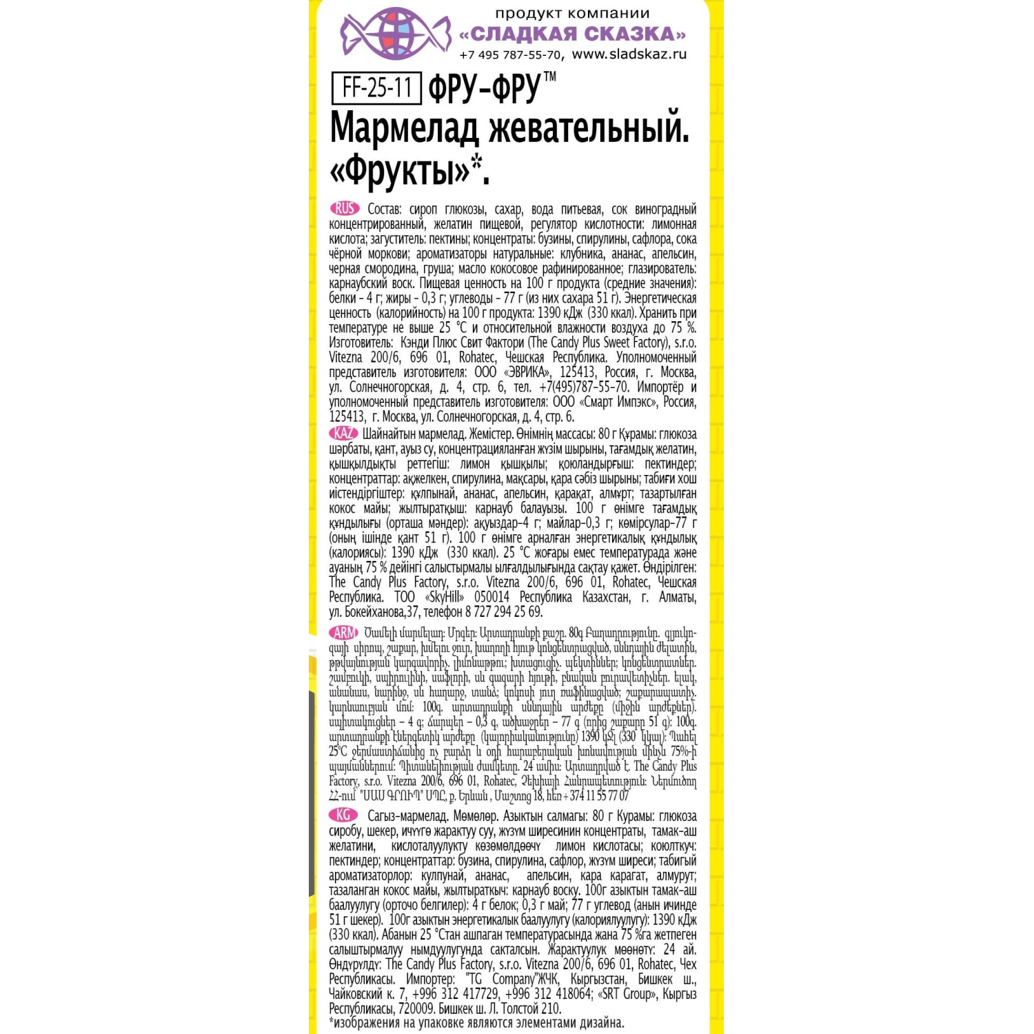 Состав: сироп глюкозы, сахар, вода питьевая, сок виноградный концентрированный, желатин пищевой, регулятор кислотности: лимонная кислота; загуститель: пектины; концентраты: бузины, спирулины, сафлора, сока чёрной моркови; ароматизаторы натуральные: клубника, ананас, апельсин, чёрная смородина, груша; масло кокосовое рафинированное; глазирователь: карнаубский воск.