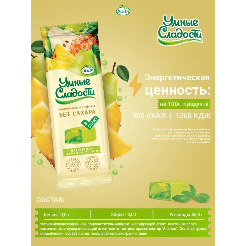 О товаре «Мармелад конфеты Умные сладости Di&Di желейные ананас-зеленая груша 90 г»