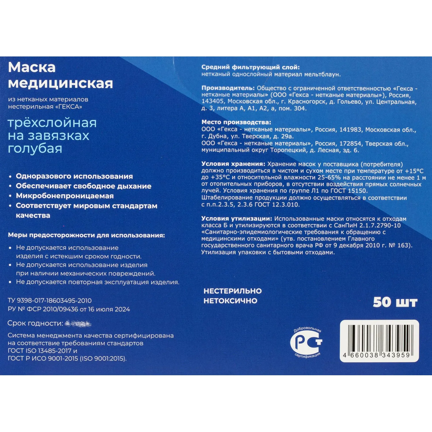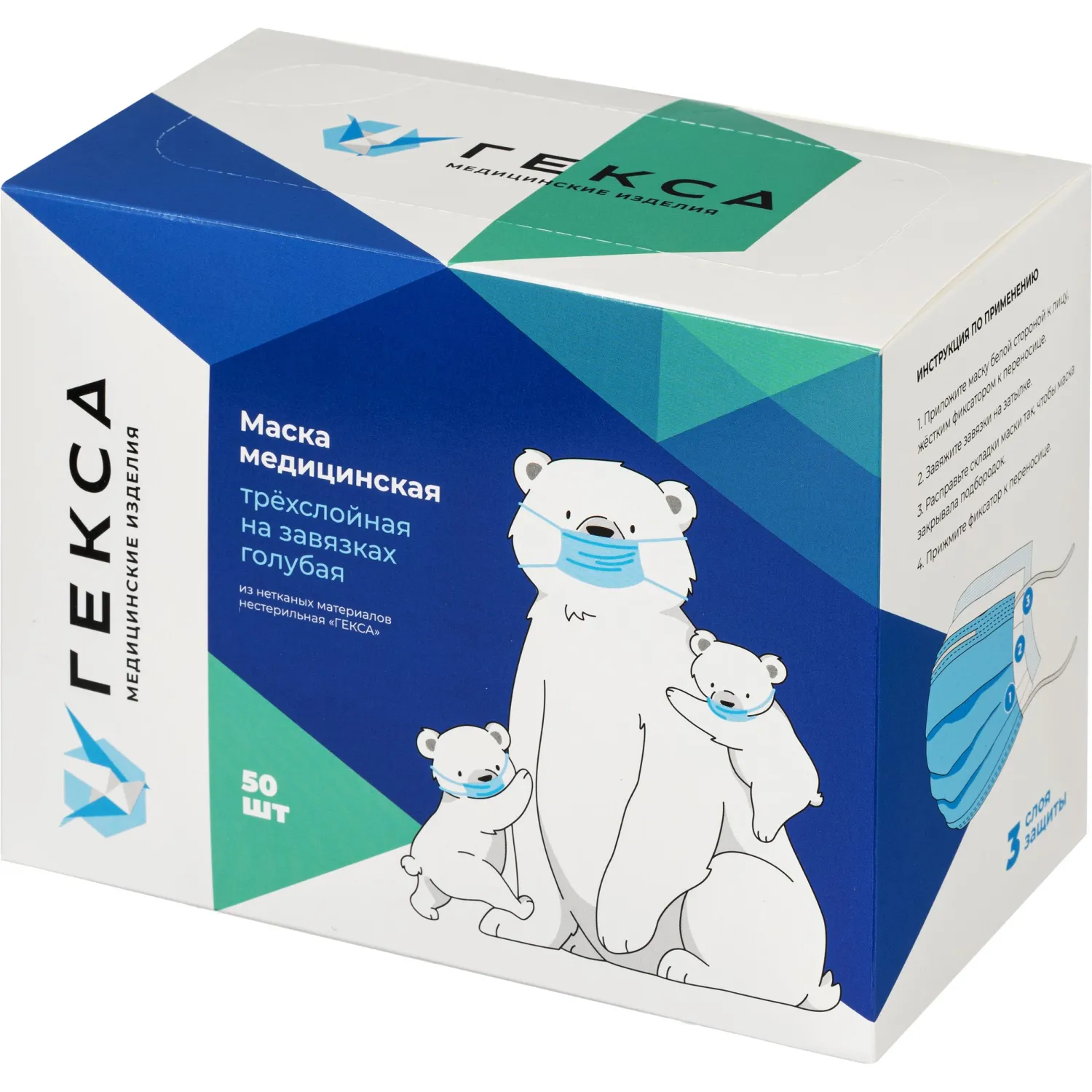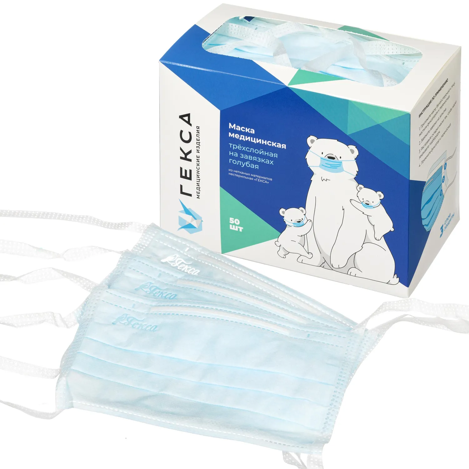 О товаре «Маска медицинская одноразовая Гекса трехслойная голубая на завязках (50 штук в упаковке)»