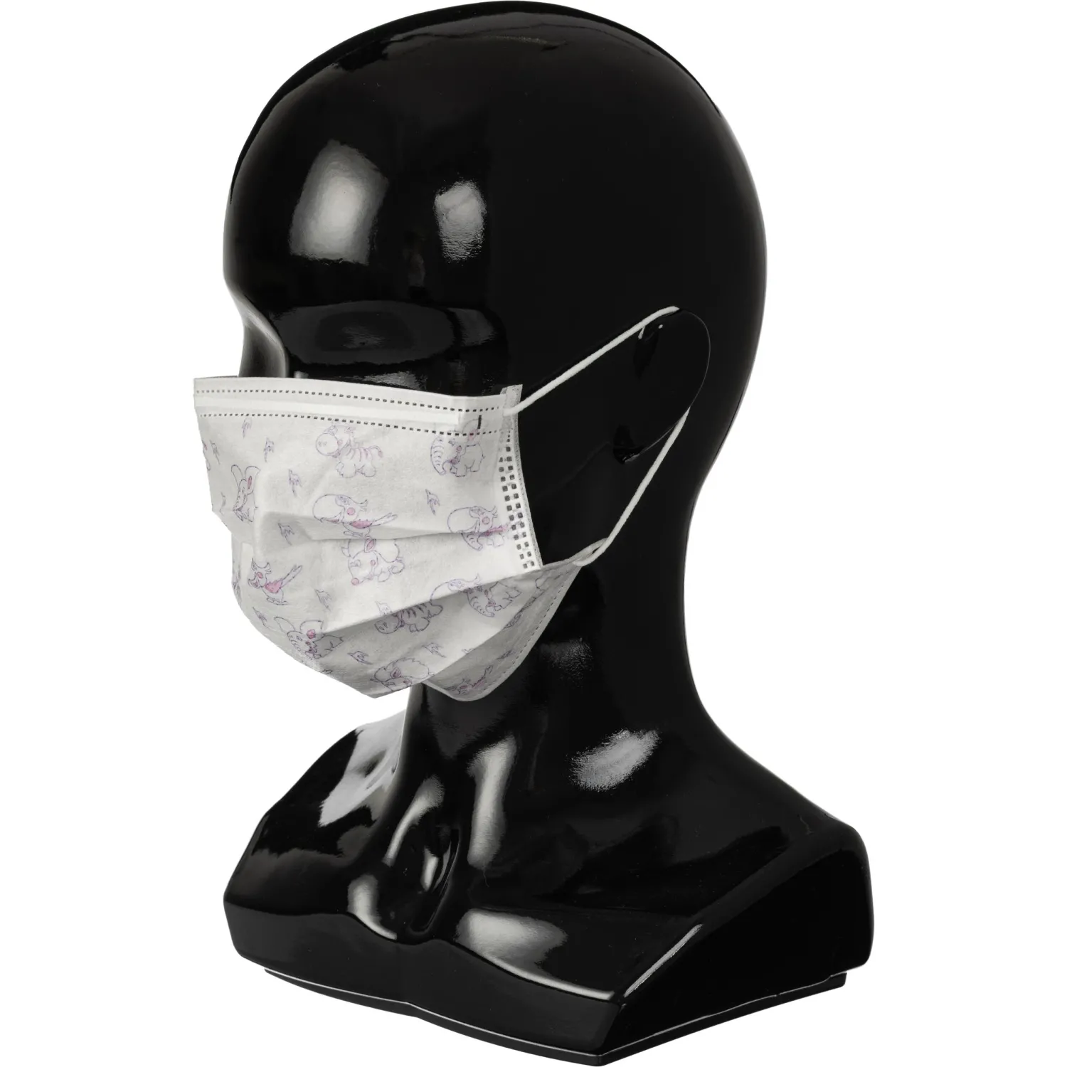 Маска медицинская трехслойная на резинках одноразовая с рисунком. Имеет носовой фиксатор длиной 8 см для более плотного и комфортного прилегания маски в области носа. Размер: 17,5×9,5 см. Трехслойная: 2 наружных слоя изготовлены из гипоаллергенного полипропиленового нетканого материала, обладающего водоотталкивающими свойствами, воздухопроницаемостью и пониженным ворсоотделением. Фильтрующий элемент (промежуточный слой) — мельтблаун. Упакована в коробки по 100 шт. Нестерильно. Срок годности 4 года.
