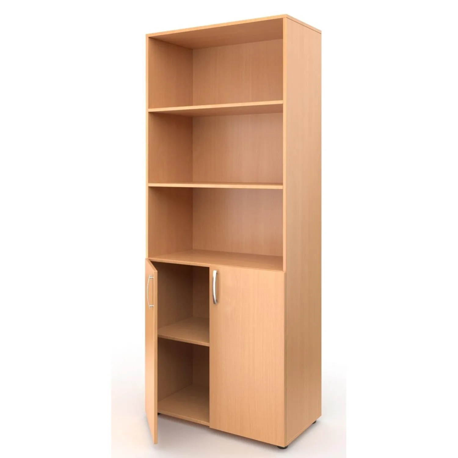 Шкаф выполнен из ЛДСП цвета бук, кромка — ПВХ. Представляет собой полуоткрытую секцию. Верхняя секция открытая, с тремя полками. Нижняя секция закрытая, с двумя полками. Отлично подходит для хранения учебных пособий.