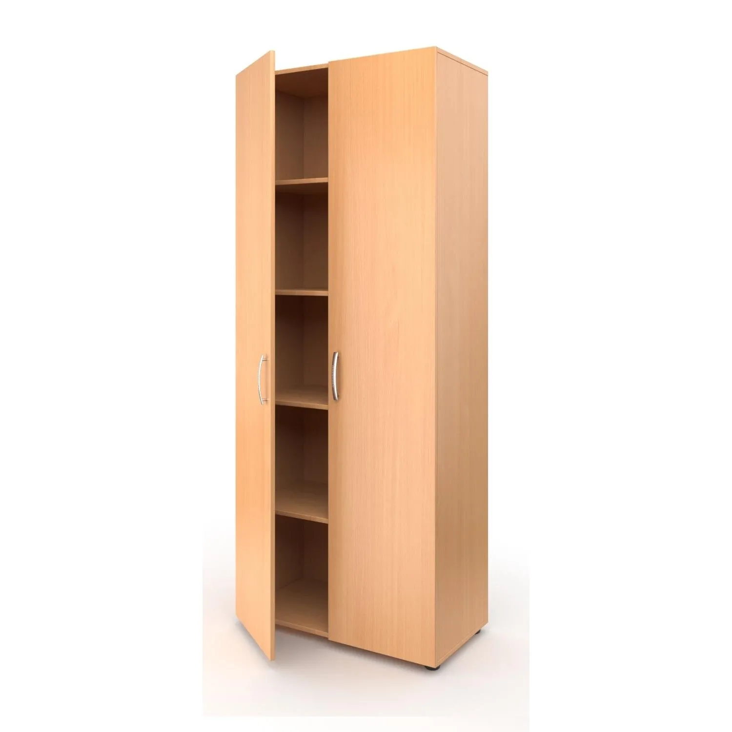 Широкий закрытый шкаф с двумя дверями выполнен из ЛДСП, цвета бук. Кромка защищена лентой ПВХ. Состоит из четырех полок. Отлично подходит для хранения учебных пособий.