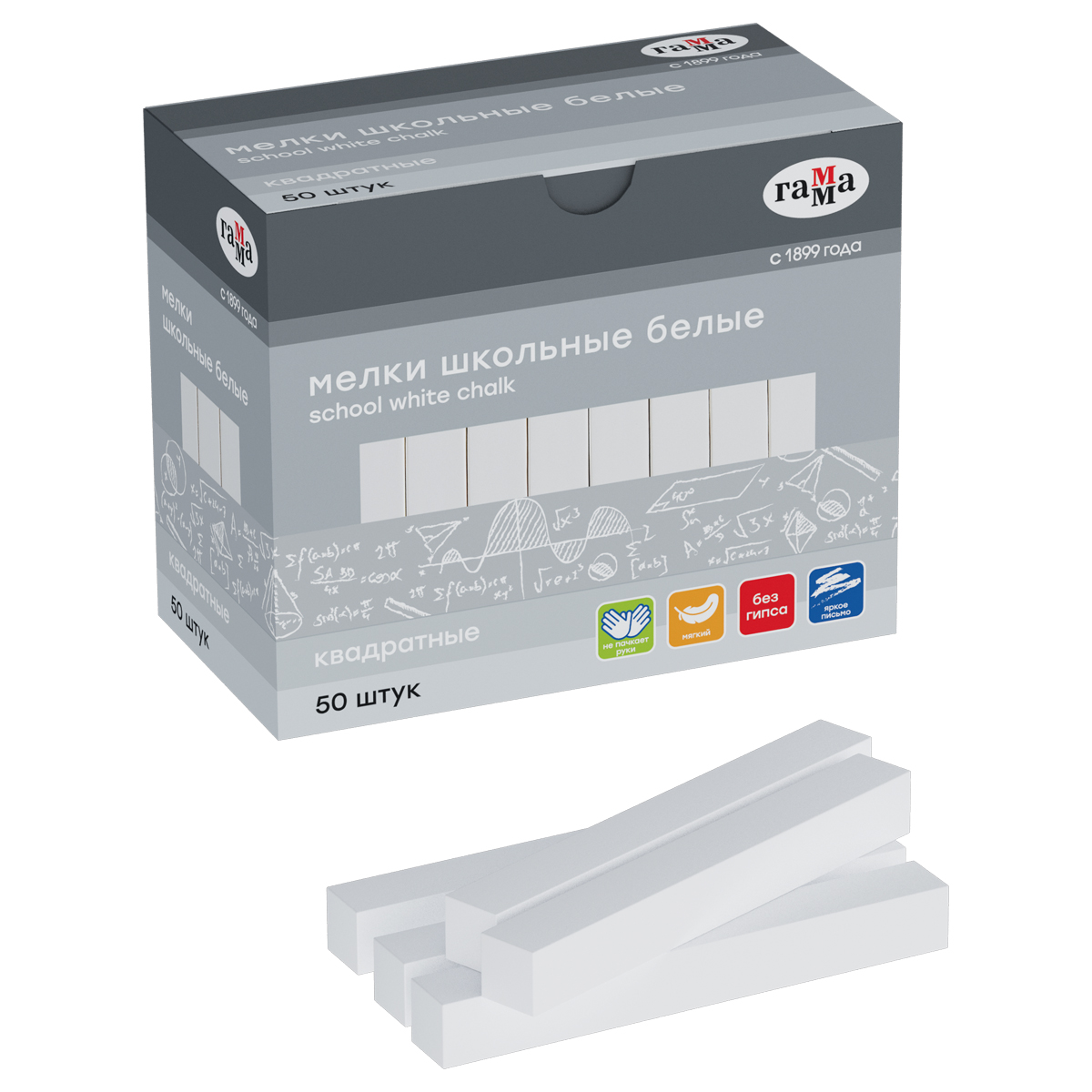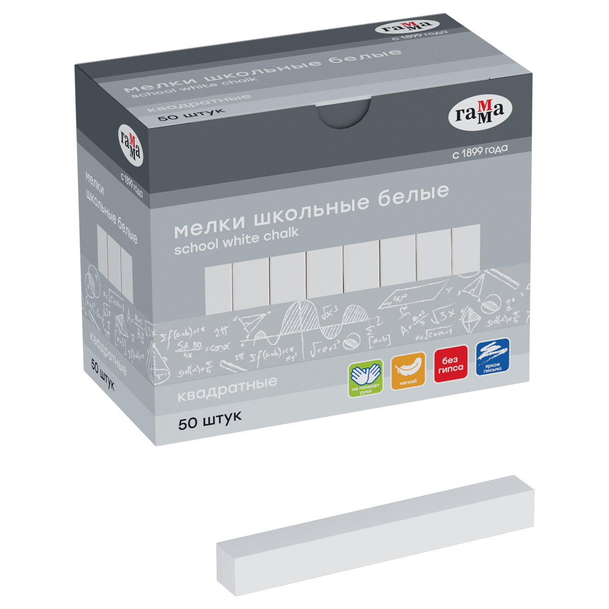 Квадратный школьный белый мягкий мел ГАММА подходит для письма или рисования на школьной доске и любой шероховатой поверхности. Длина мелка — 8 см. В наборе 50 мелков.