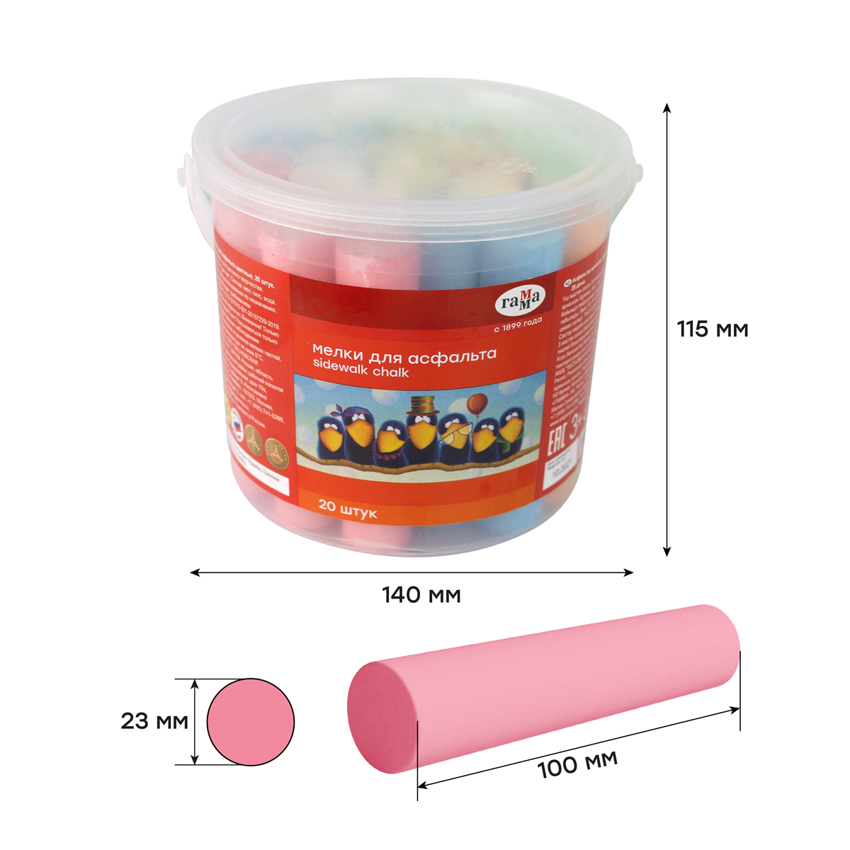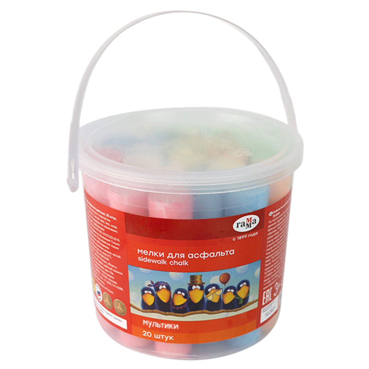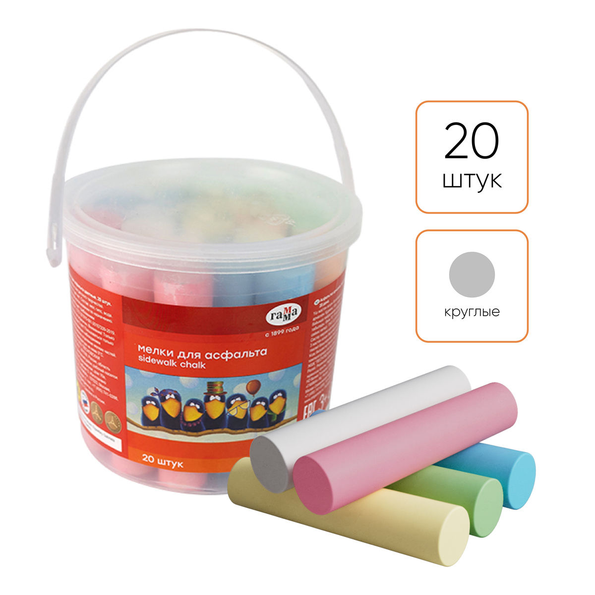 Набор из 20 круглых мелков ГАММА серии «Мультики» подходит для рисования на асфальте и любой шероховатой поверхности и состоит из 6 цветов: 2 белых, 4 желтых, 4 зеленых, 4 синих, 4 красных, 2 оранжевых. Длина — 10 см, диаметр — 22 мм.