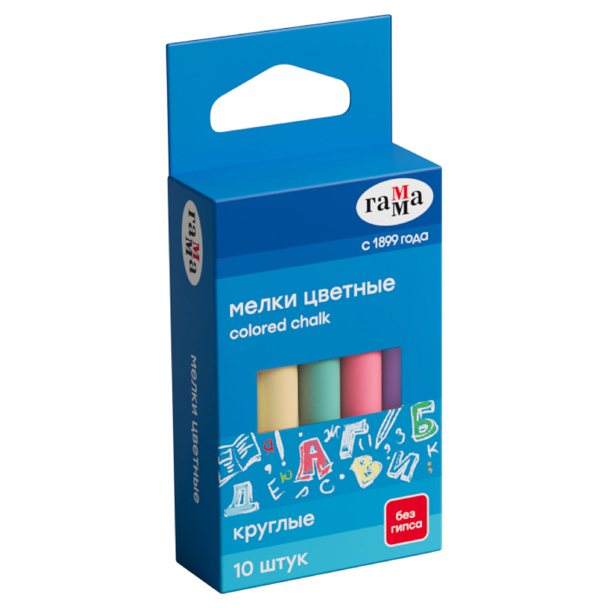 Набор из 10 круглых школьных мелков ГАММА для классных и аудиторных досок, а также для рисования на асфальте состоит из 10 ярких цветов ассорти.