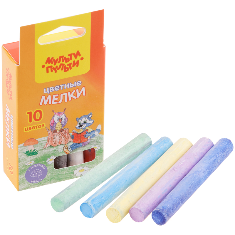 Набор из 10 круглых мелков Мульти-Пульти «Енот в Австралии» для письма на досках состоит из 10 цветов ассорти: синего, зелёного, жёлтого, красного, оранжевого, коричневого, сиреневого, фиолетового, белого, бежевого.