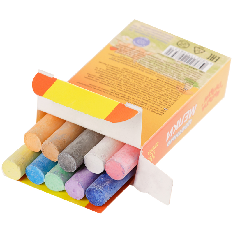 Удобная форма и мягкое письмо. Натуральный состав на основе мела, гипса, воды и пигментов, без выраженного запаха. Мелки нетоксичные. Средняя твёрдость. Следы мелков легко счищаются с рук. Набор упакован в картонную коробку с европодвесом. Предназначен для детей старше 3-х лет.