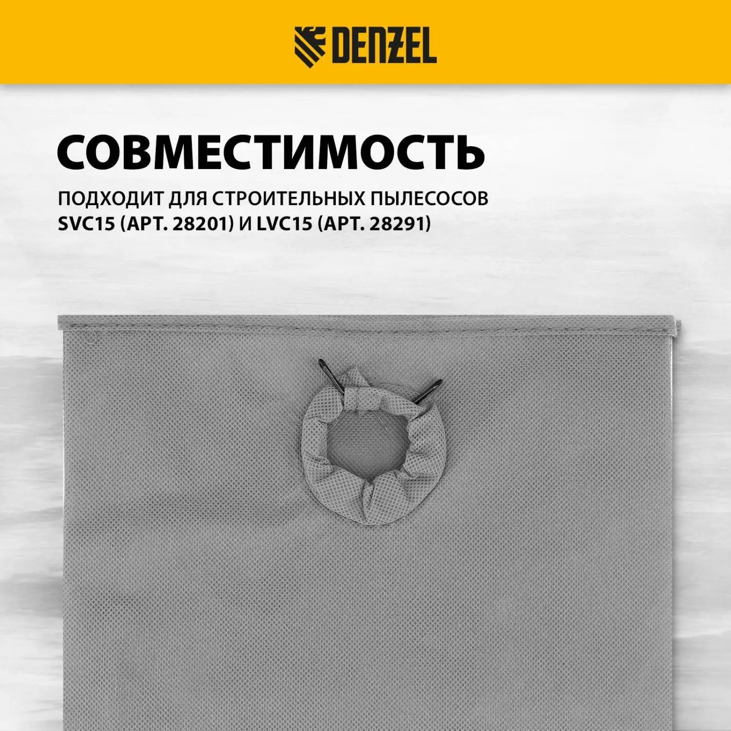 Многоразовый тканевый мешок Denzel 28212 — сменный аксессуар для строительных пылесосов SVC15 (28201), LVC15 (28291). Устанавливается в бак пылесоса и служит для сбора мусора во время сухой уборки.