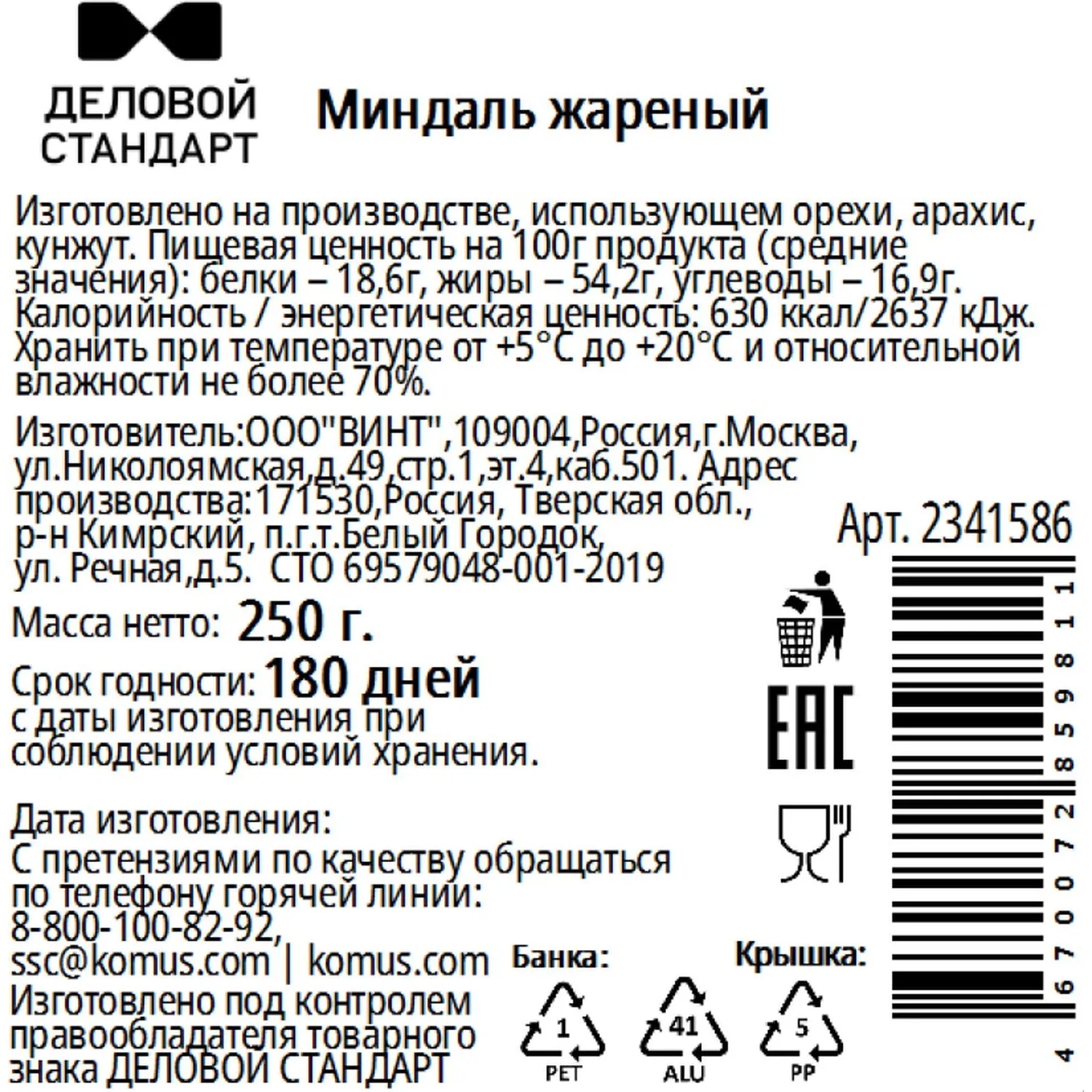 О товаре «Миндаль Деловой Стандарт жареный в банке, 250 г»