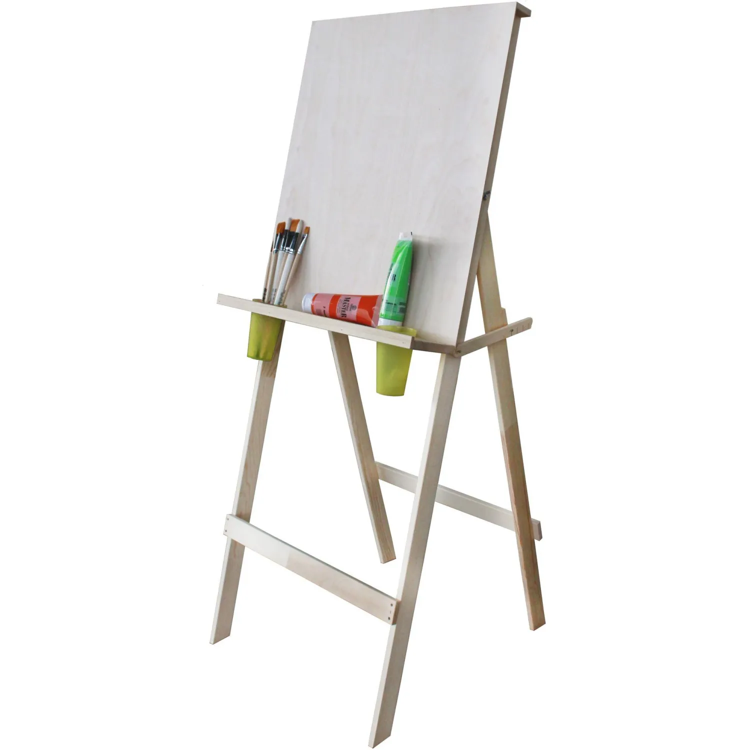 Мольберт-хлопушка — ученический мольберт идеально подойдет для занятий по рисунку или живописи. Оснащен широкой полкой со стаканчиками для удобства работы и хранения рабочих инструментов. Размер рабочей поверхности 600×700 мм, ширина полки 120 мм. Высота холста — 70 см. Общая высота мольберта — 135см.