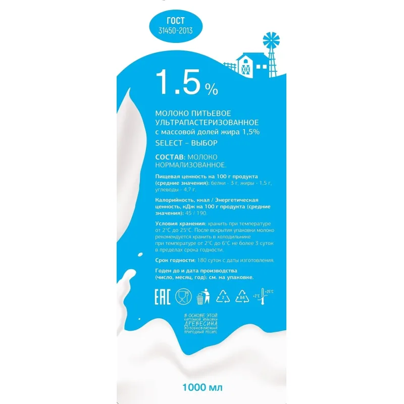 Состав: молоко нормализованное. Пищевая ценность на 100 г продукта: белки 3 г, жиры 1,5 г, углеводы 4,7 г. Энергетическая ценность: 45 ккал / 190 кДж. Условия хранения: хранить при температуре от +2°С до +25°С. После вскрытия упаковки хранить в холодильнике при температуре от +2°С до +6°С не более 3 суток. Срок хранения: 180 суток с даты изготовления. Стандарт: ГОСТ 31450-2013. Страна производства: Россия.