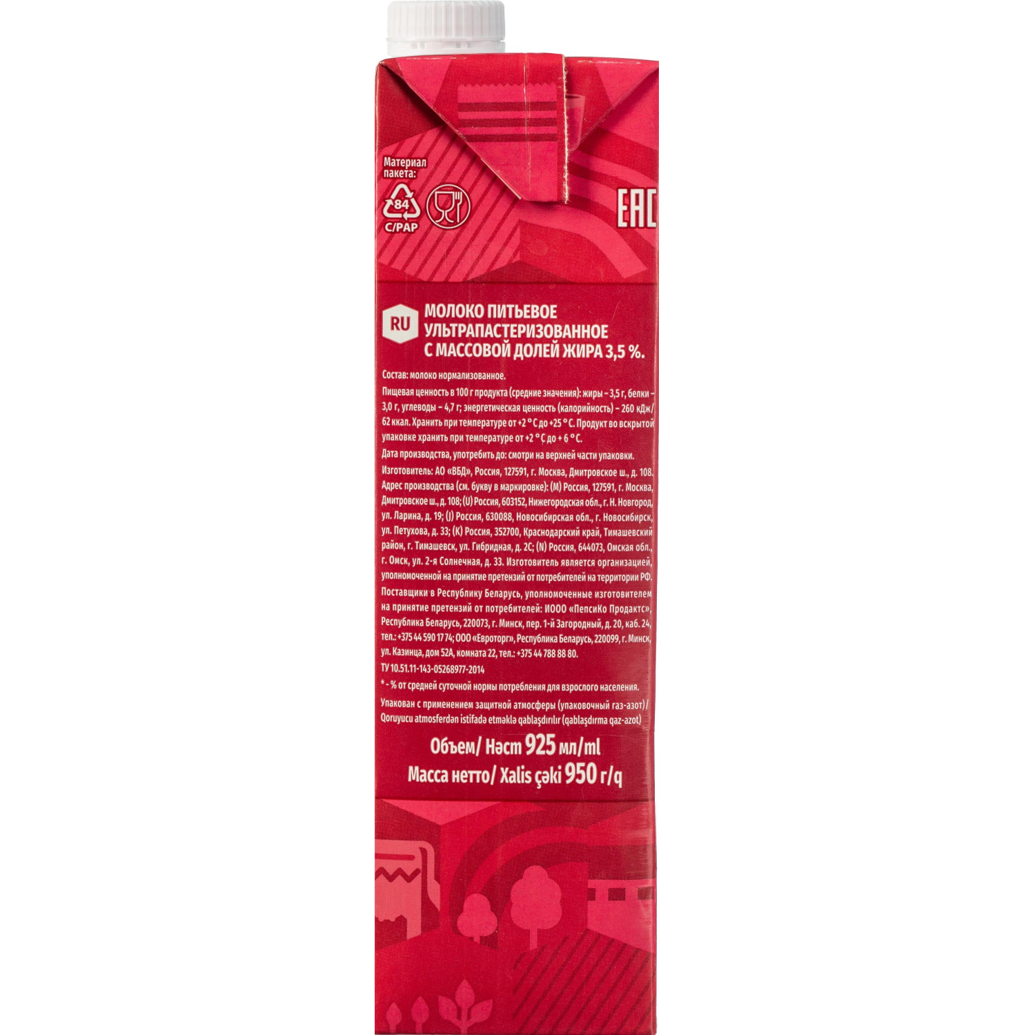 Пищевая ценность на 100 г: белки 2,8 г, жиры 3,5 г, углеводы 4,7 г. Энергетическая ценность: 62 ккал. Состав: молоко цельное, сливки. Условия хранения: от 0°С до +25°С. Срок хранения: 12 месяцев.