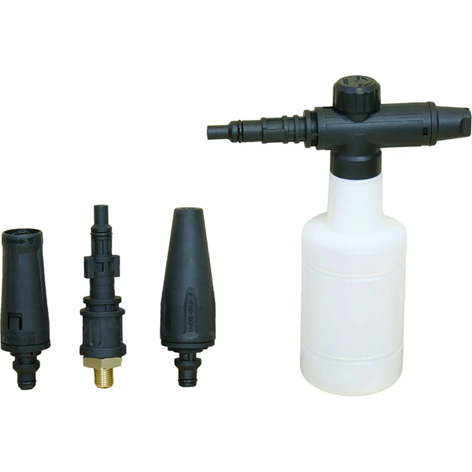 В комплекте пеногенератор с регулятором подачи пены, а также переходник для использования профессионального «итальянского» пеногенератора, который можно приобрести отдельно.