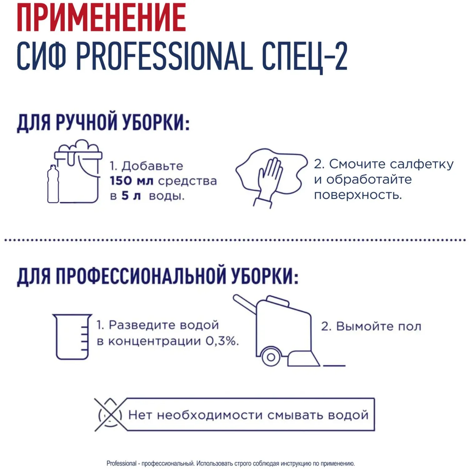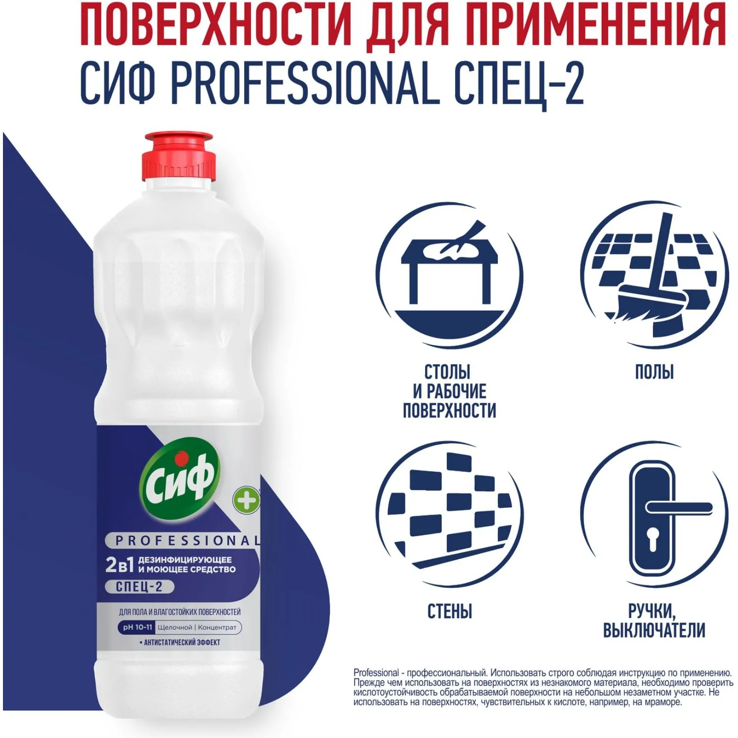 Назначение: универсальное моющее средство Сиф Professional СПЕЦ-2 для ежедневного очищения и дезинфекции столов и рабочих поверхностей, пола, использования в поломоечных машинах в кафе и ресторанах, на пищевых производствах, офисах, бизнес центрах и в других местах общественного пользования.