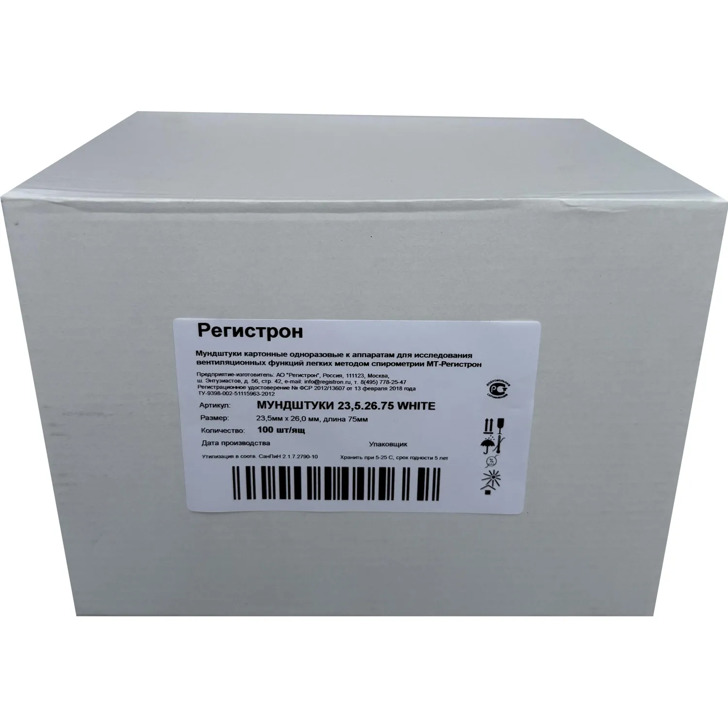 Мундштук-загубник одноразовый Регистрон предназначен для исследования вентиляционных функций лёгких методом спирометрии. Изготовлен из качественного картона и имеет размеры 23,5×26×75 мм. Внутренний диаметр мундштука не превышает 23,5 мм, длина — не более 75 мм, а толщина стенки составляет не менее 1,25 мм, что делает мундштук удобным и надёжным для проведения точных исследований.