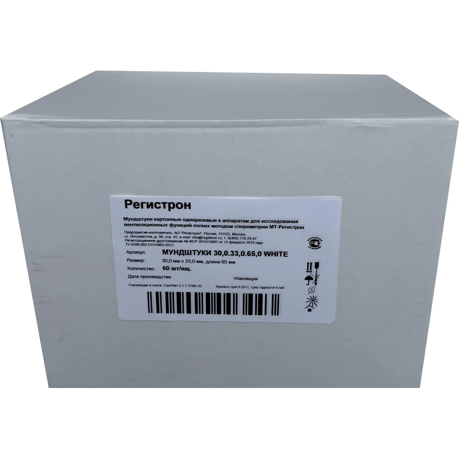Мундштук-загубник одноразовый Регистрон предназначен для исследования вентиляционных функций лёгких методом спирометрии. Изготовлен из качественного картона и имеет размеры 30×33×65 мм. Внутренний диаметр мундштука не превышает 30 мм, длина — не более 65 мм, а толщина стенки составляет не менее 1,5 мм, что обеспечивает его надёжность и долговечность при использовании.