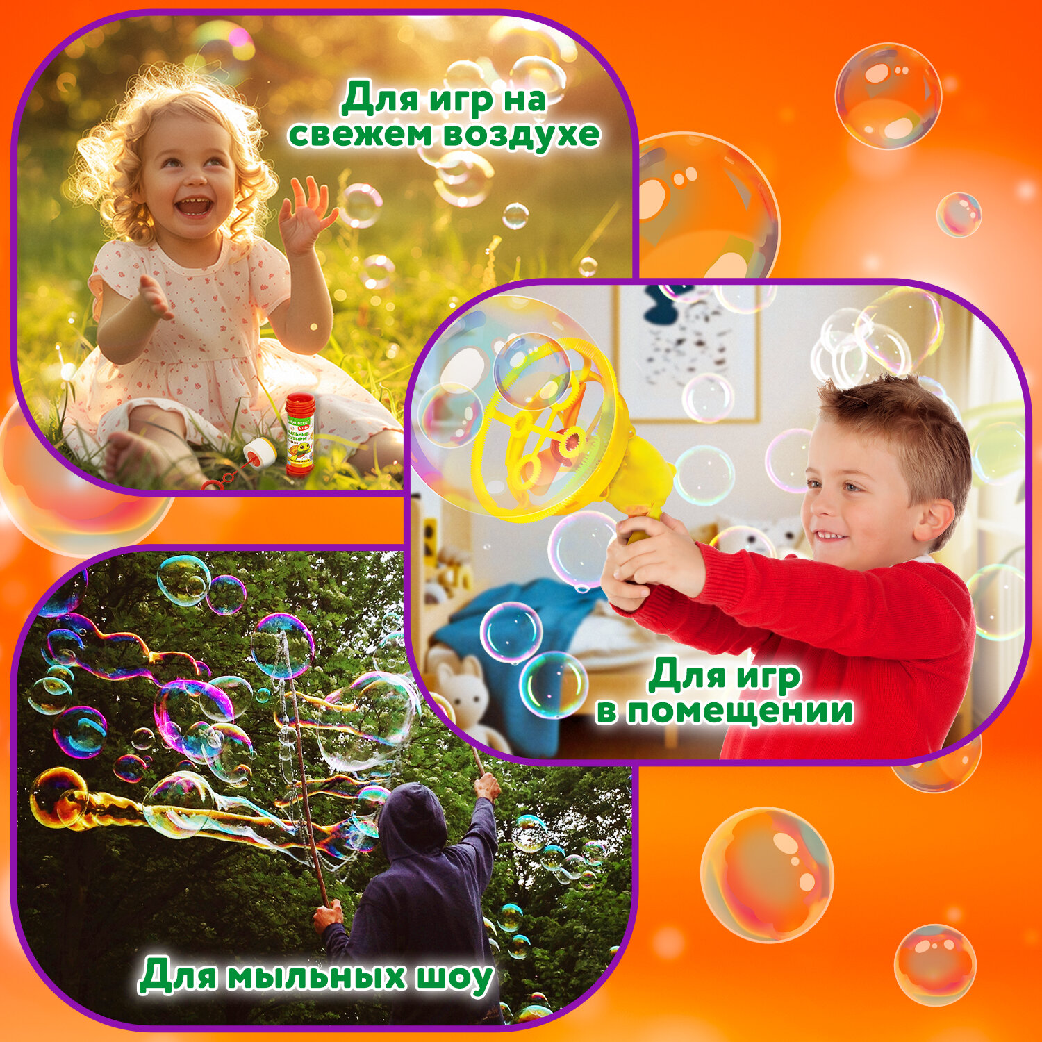 Раствор для мыльных пузырей подходит для заправки всевозможных игрушек-пистолетов и генераторов мыльных пузырей.
